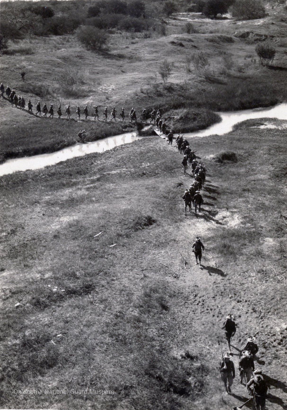 A long line of soldiers marches through a desert landscape, crossing a small stream.