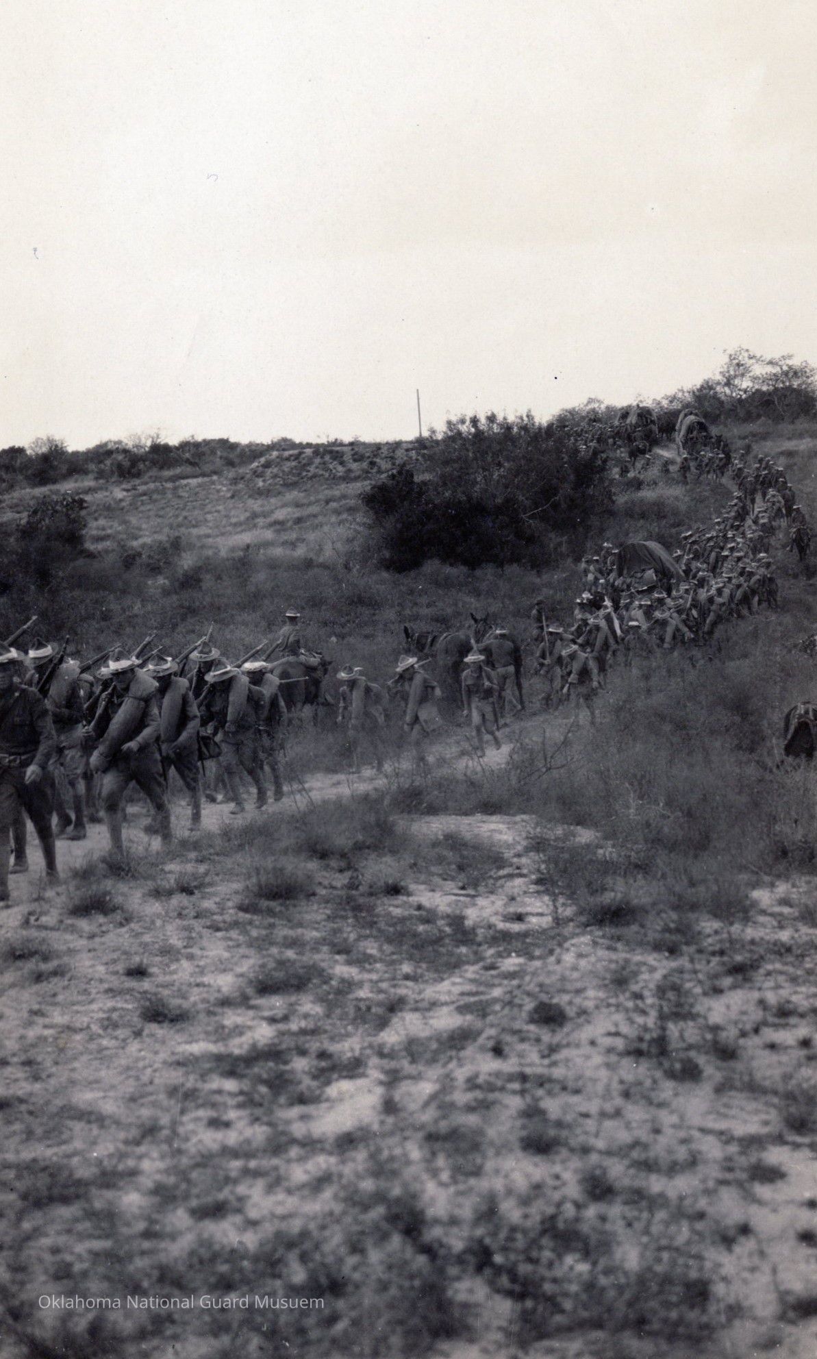 The black-and-white photo shows a troop of soldiers marching through a rugged, desert landscape.