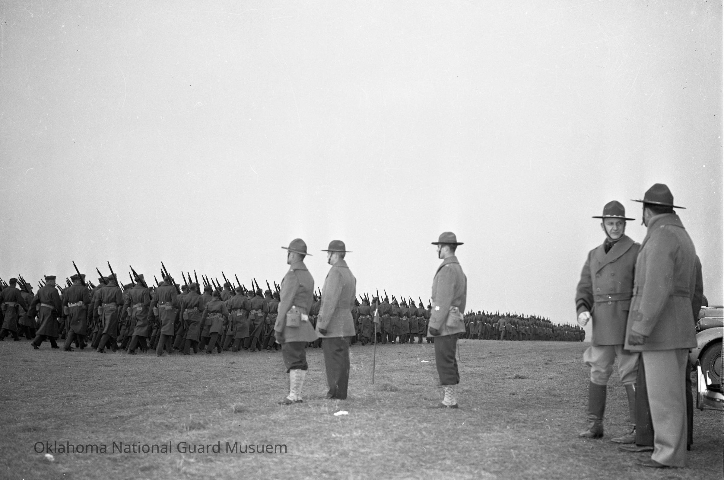 Negative of soldiers marching in review