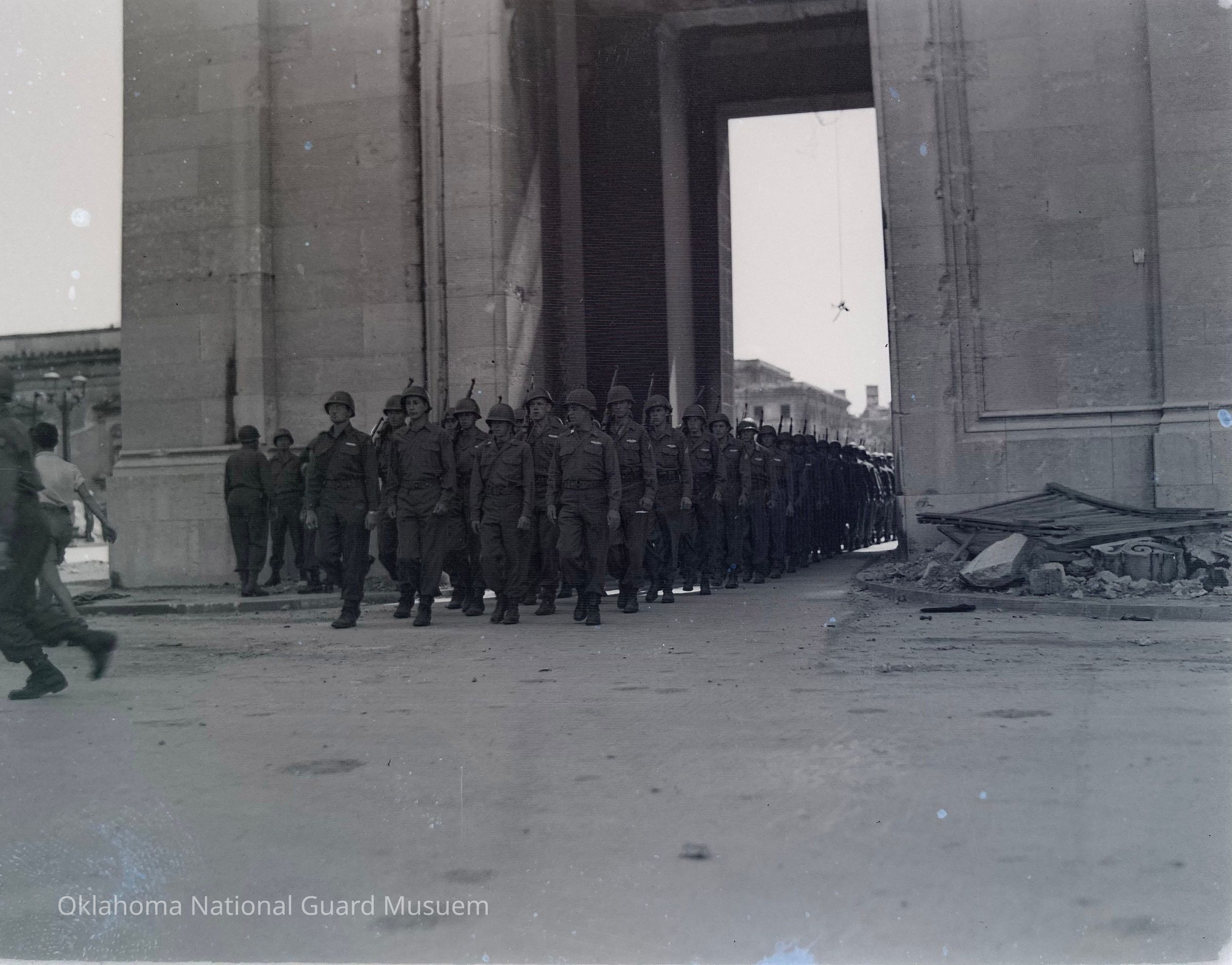Negative of soldiers marching into Koenigs Platz for Memorial Day ceremony