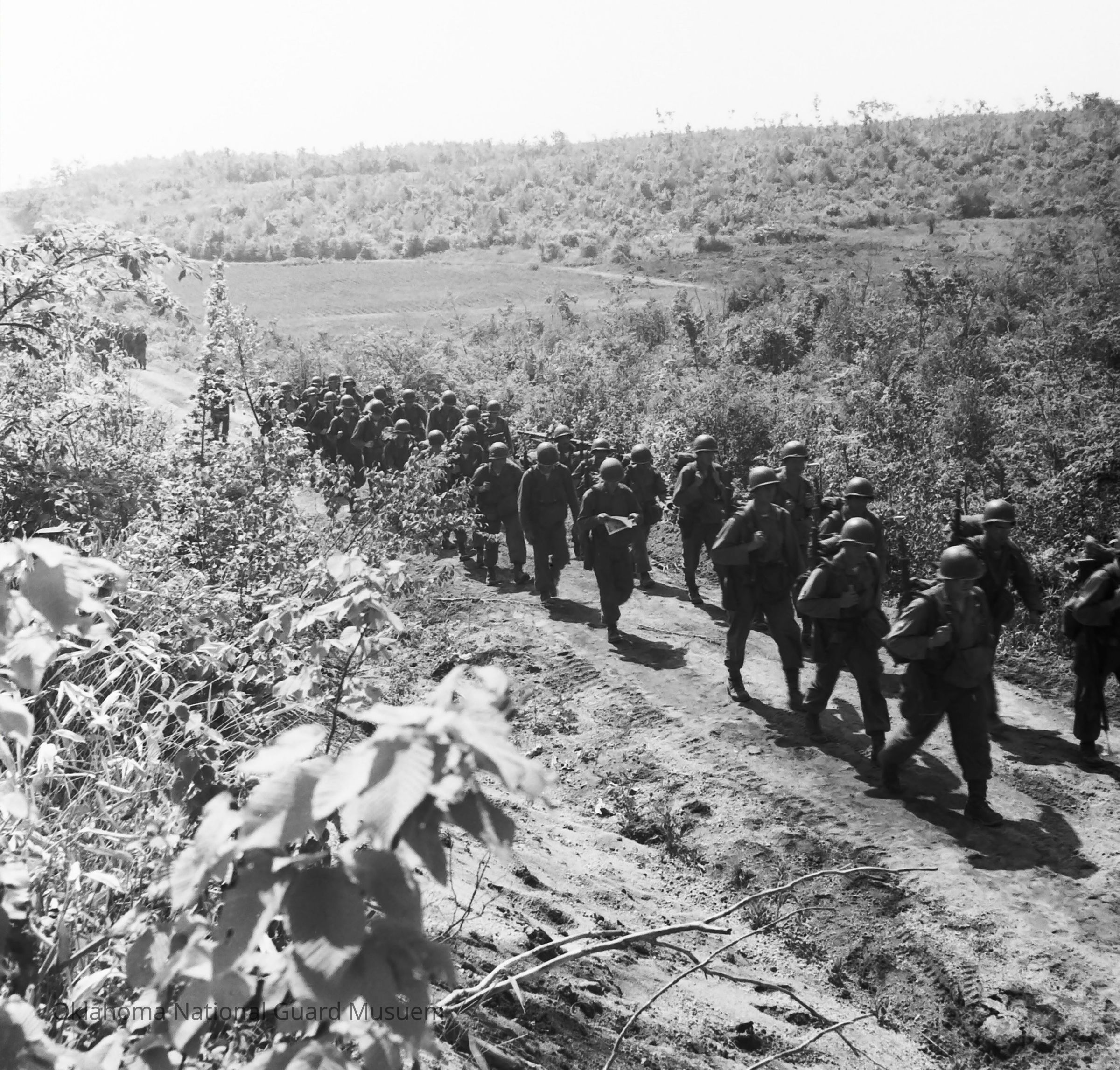 Negative of soldiers on a road march in a rural area