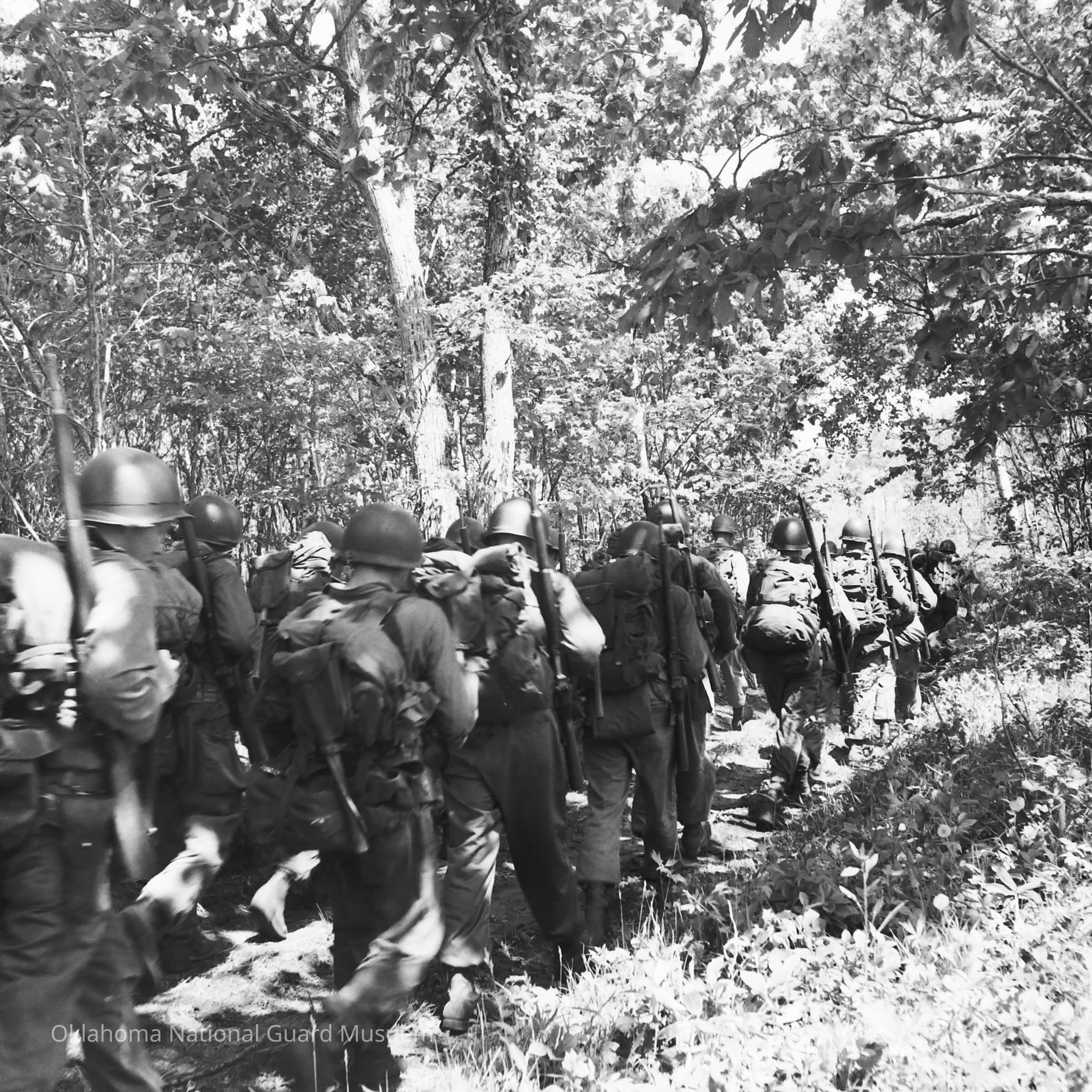 Negative of soldiers on a road march in a wooded area