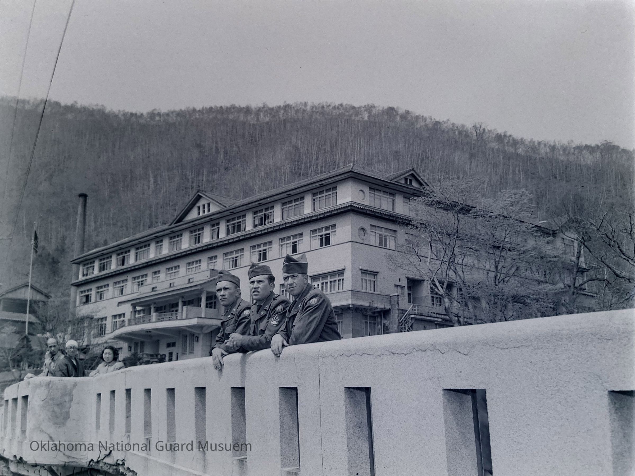 Negative of soldiers on bridge with Noboribetsu Hotel in background