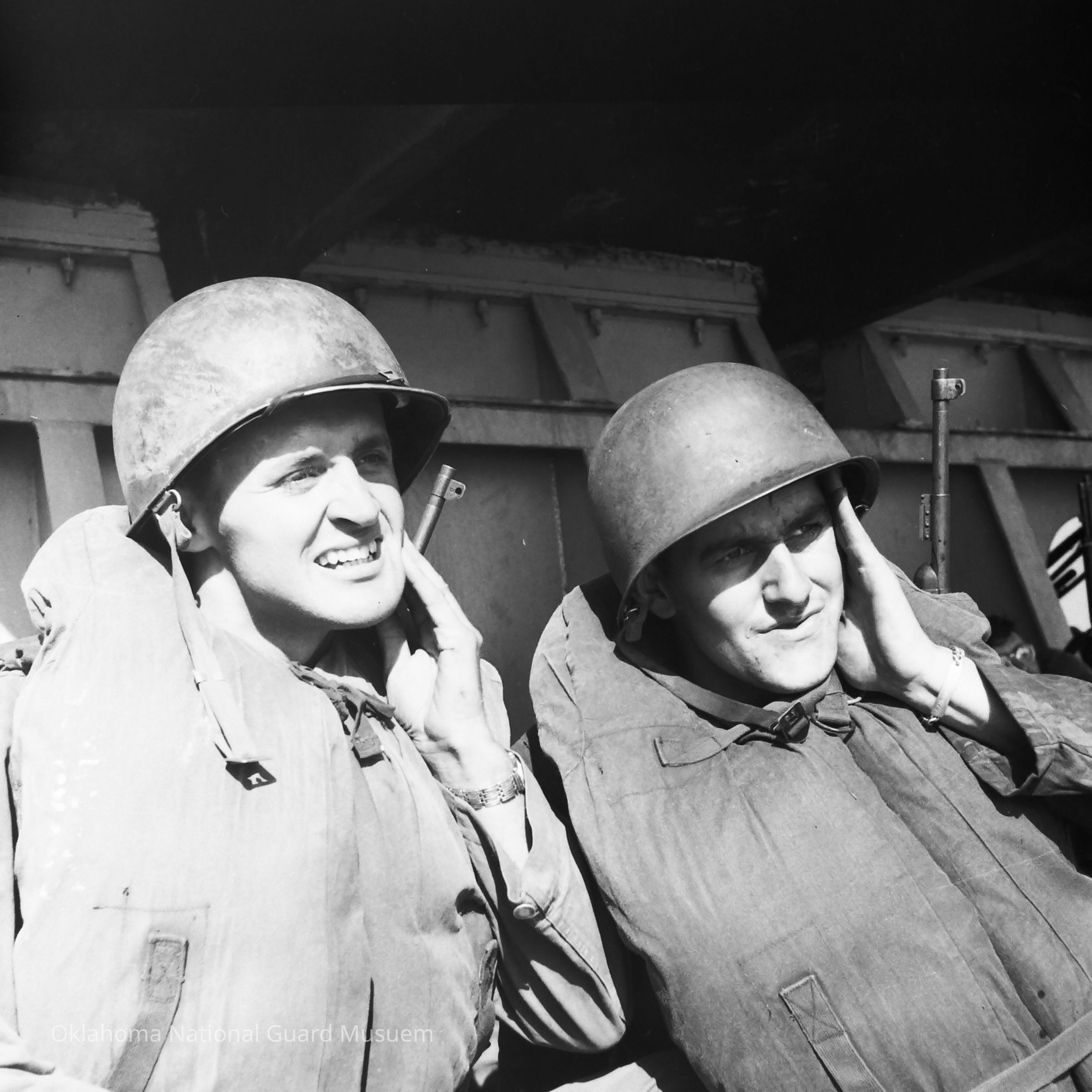 Negative of soldiers on deck with life vests