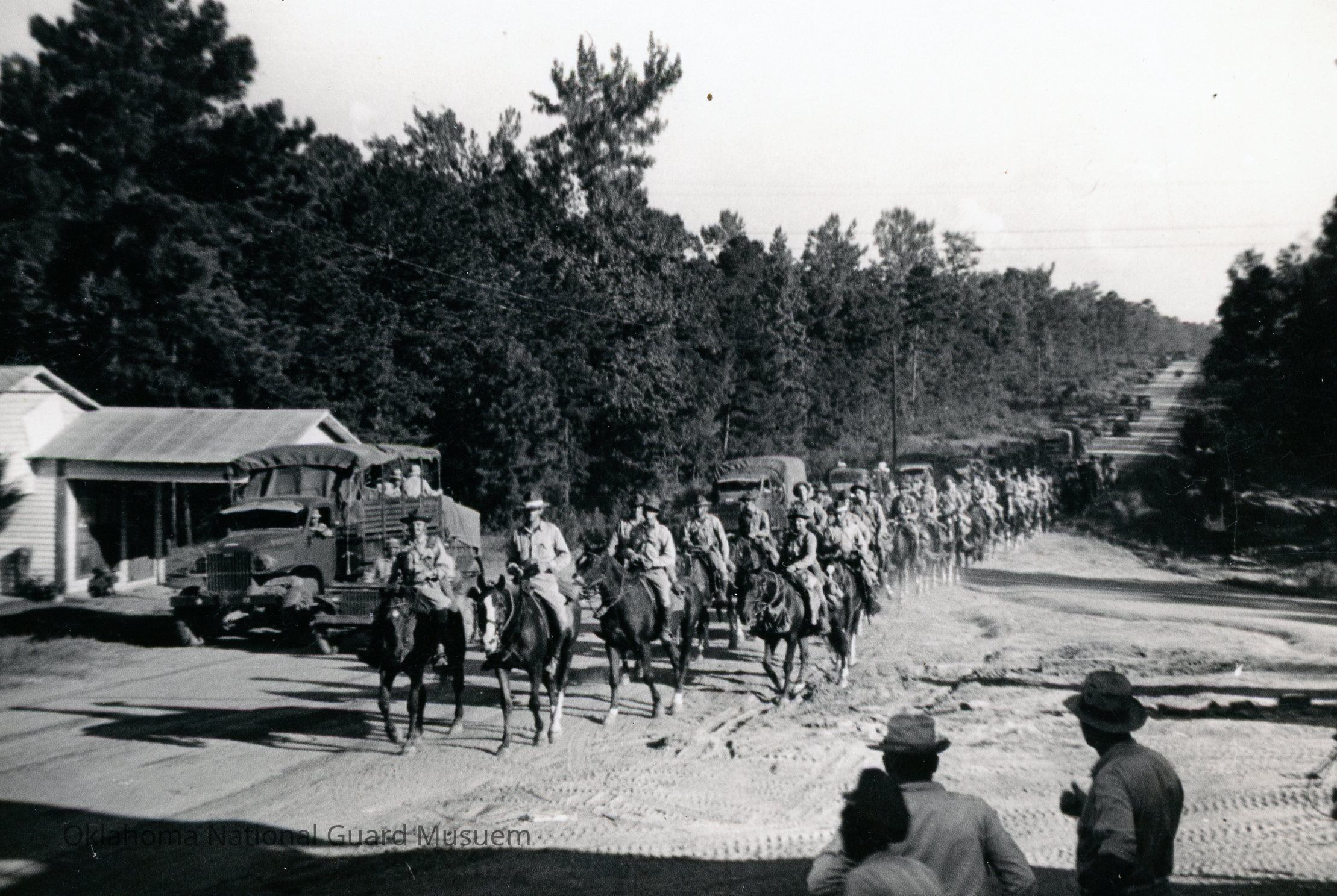 Soldiers on horseback and truck marching down road during the Louisiana Maneuvers. 189th Field Artillery