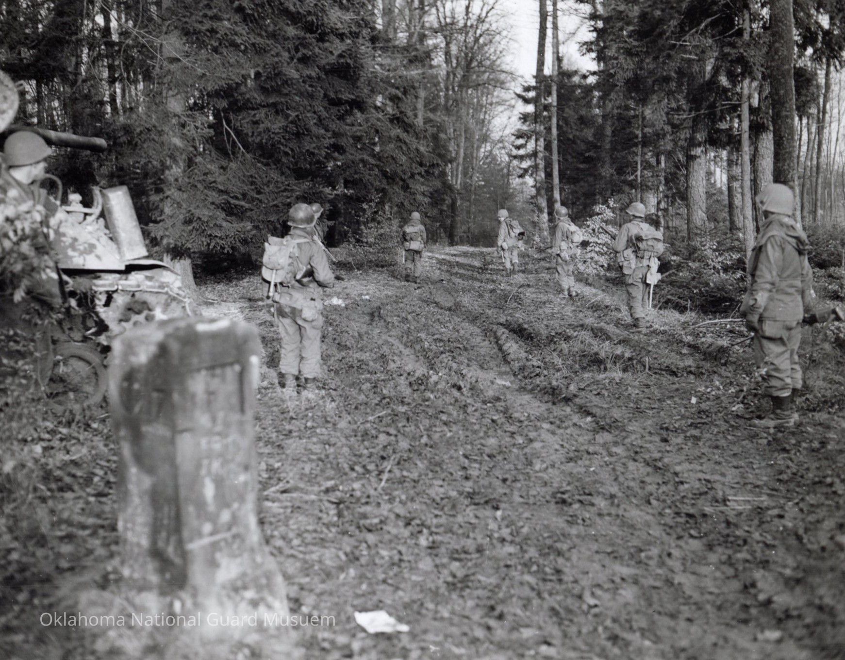 45th Division soldiers on a patrol through the forest after crossing the border into Germany