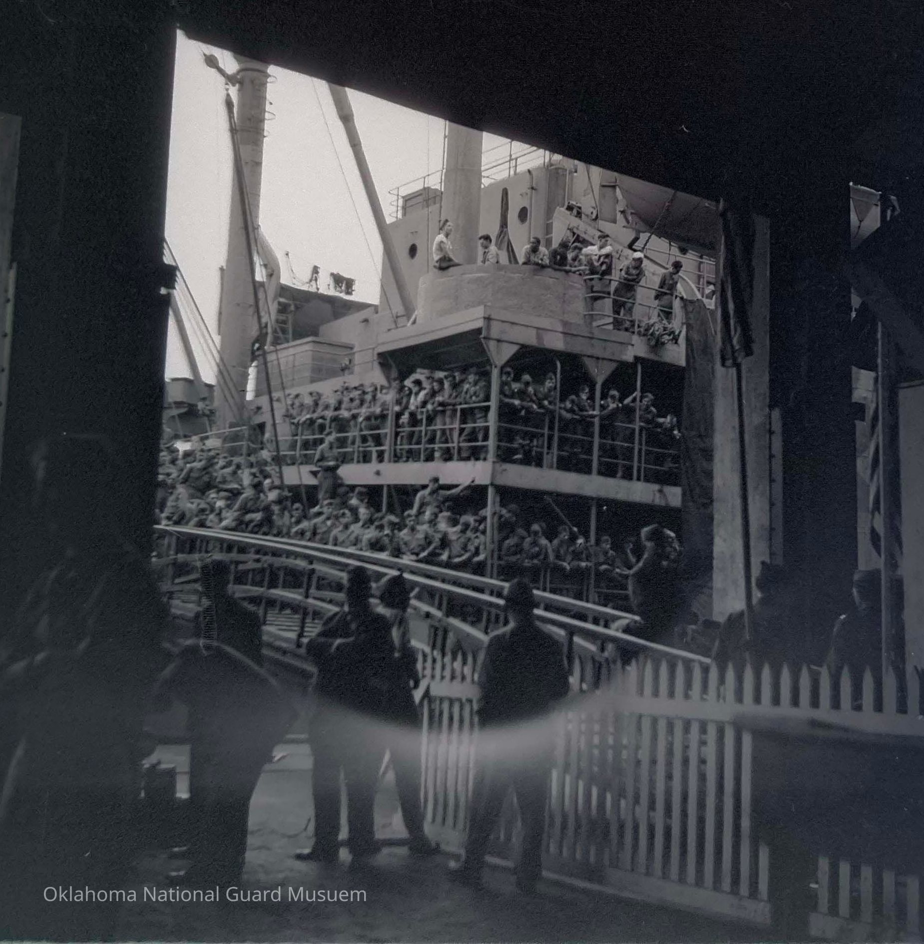 Negative of soldiers on transport ship