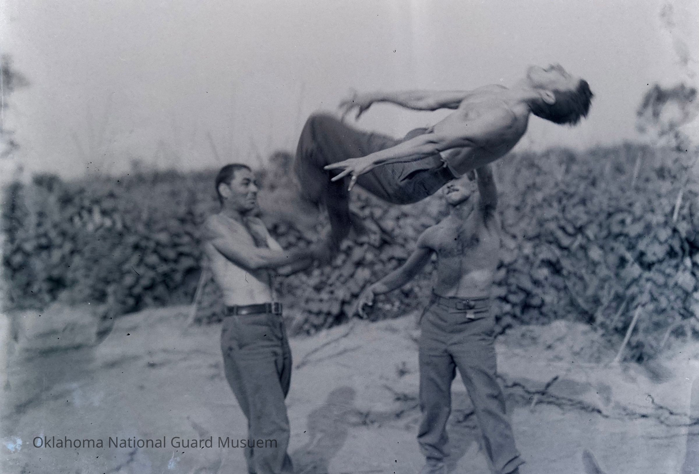 Photograph published in the 45th Division News, 18 May 1944, Vol. IV, No 38, Caption, "This back-flip is one of those things that shouldn't be tried without a soft mat underneath. Here, three members of Howard Sein's Desperados try the stunt in preparation for the show they put on under Special Services. The man in the air is Pvt. Adolph Dombeck, Amsterdam, NY; Pfc Bill Becker, Bergenfield, NJ is giving him the flip, and Pvt. Sheldon Katz, Brooklyn, guides Dombeck in the turn."Made/Created