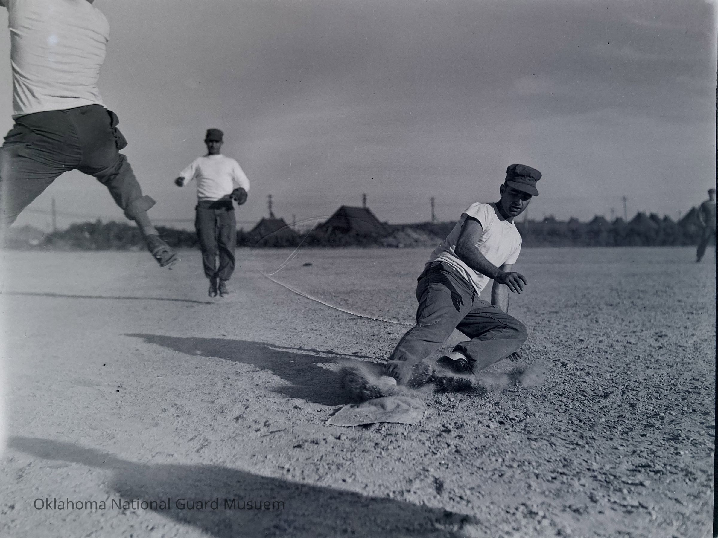 Negative of soldiers playing baseball on Hokkaido, Japan