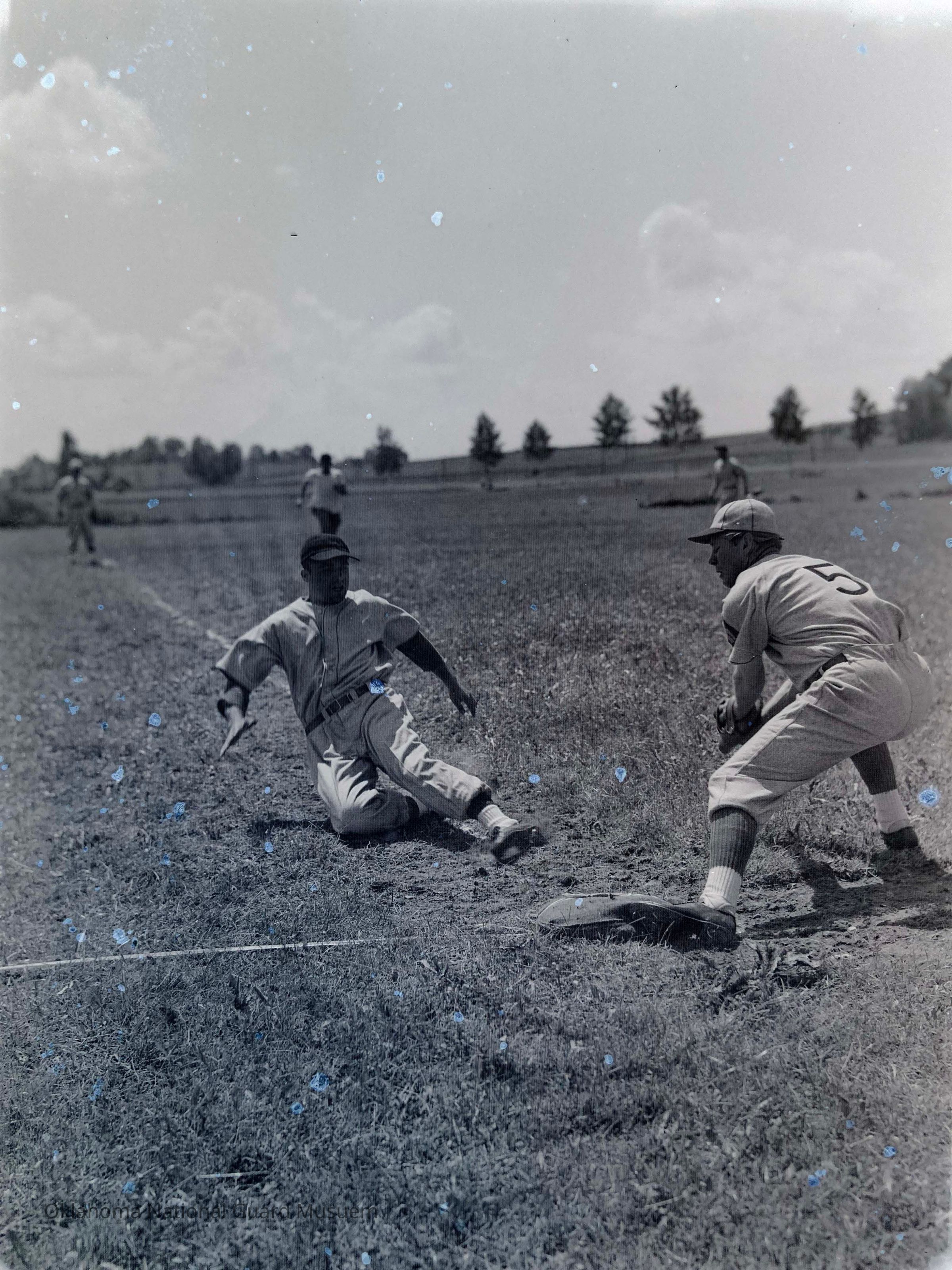 Negative of soldiers playing baseball
