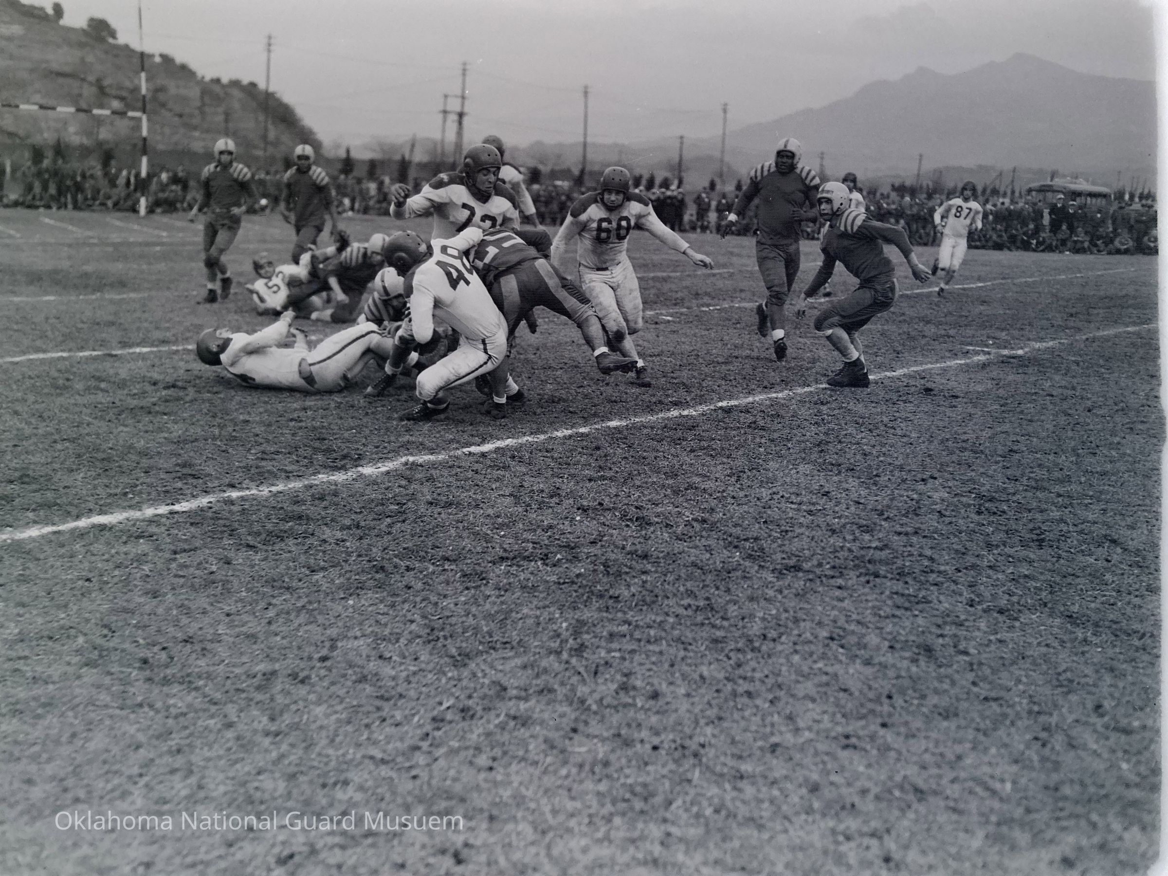 Negative of soldiers playing football on Hokkaido, Japan