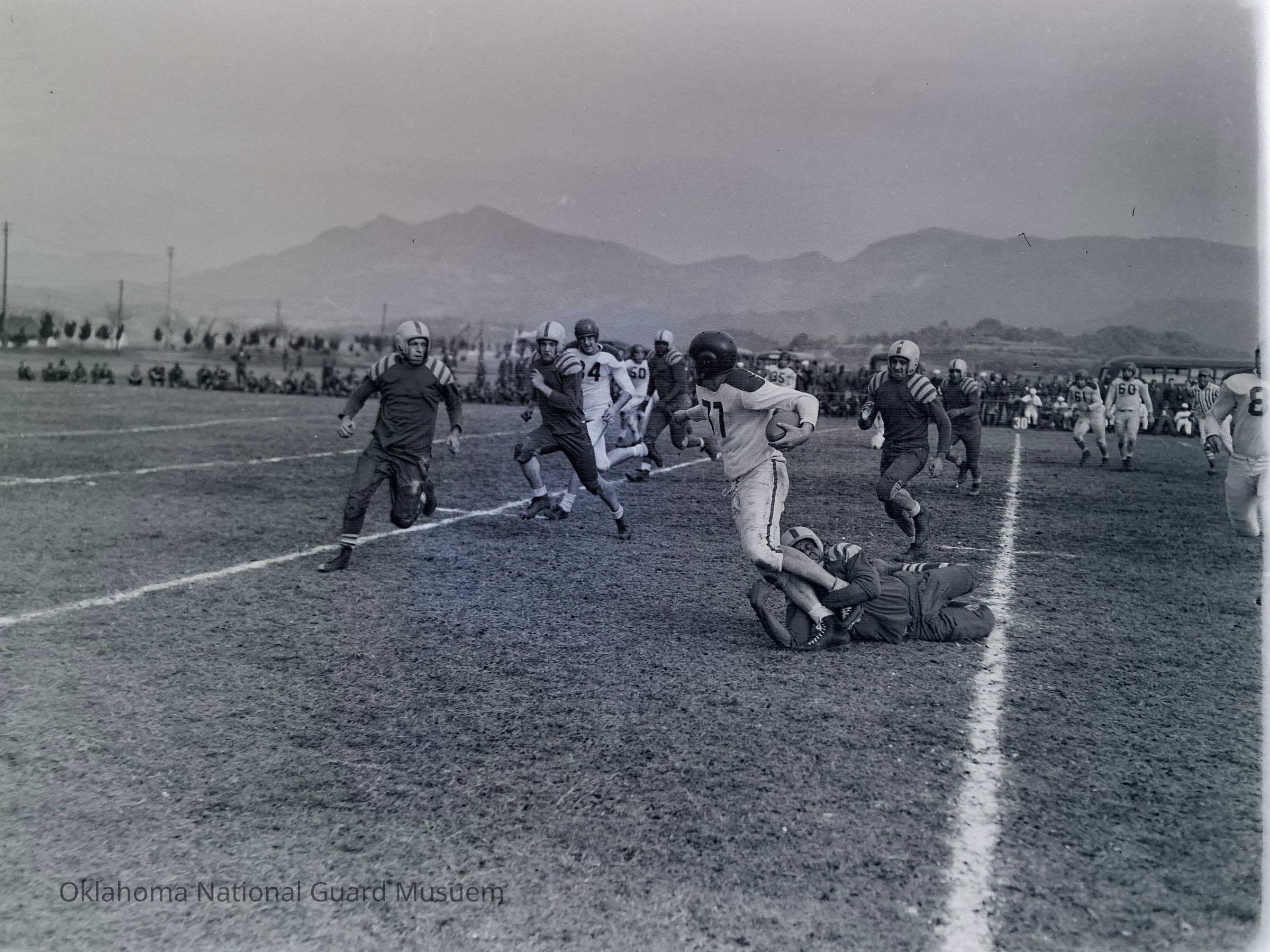Negative of soldiers playing football on Hokkaido, Japan