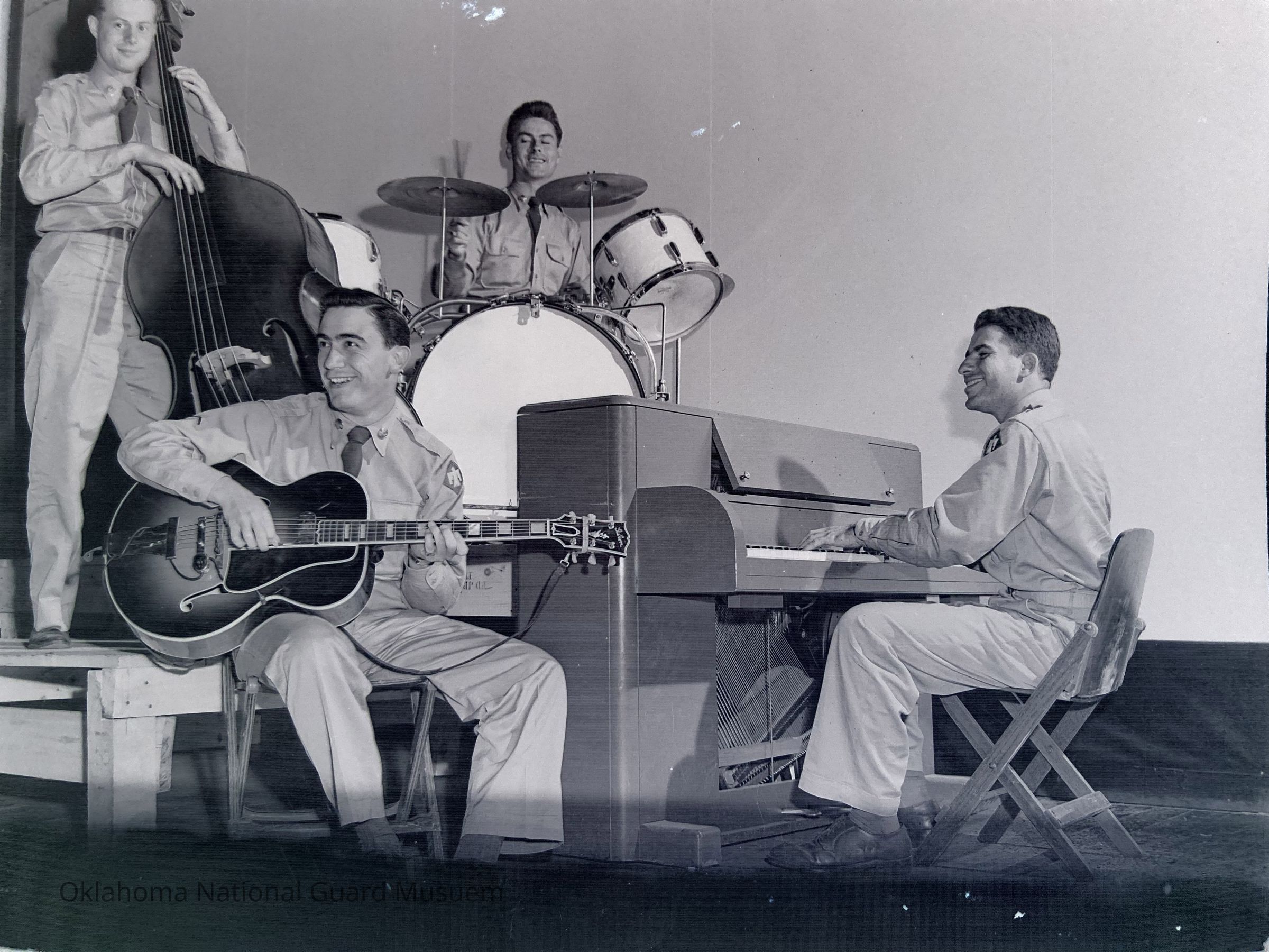 Entertainers, Soldiers, Music, Musicians, Performances, Stages (Platforms), Military bands, Pianists, Pianos, Guitars, Percussion instruments, Drums (Musical instruments), Stringed instruments