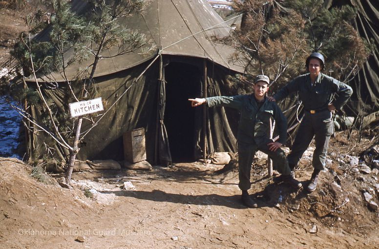 Soldiers pointing to the kitchen tent for the Headquarters Company