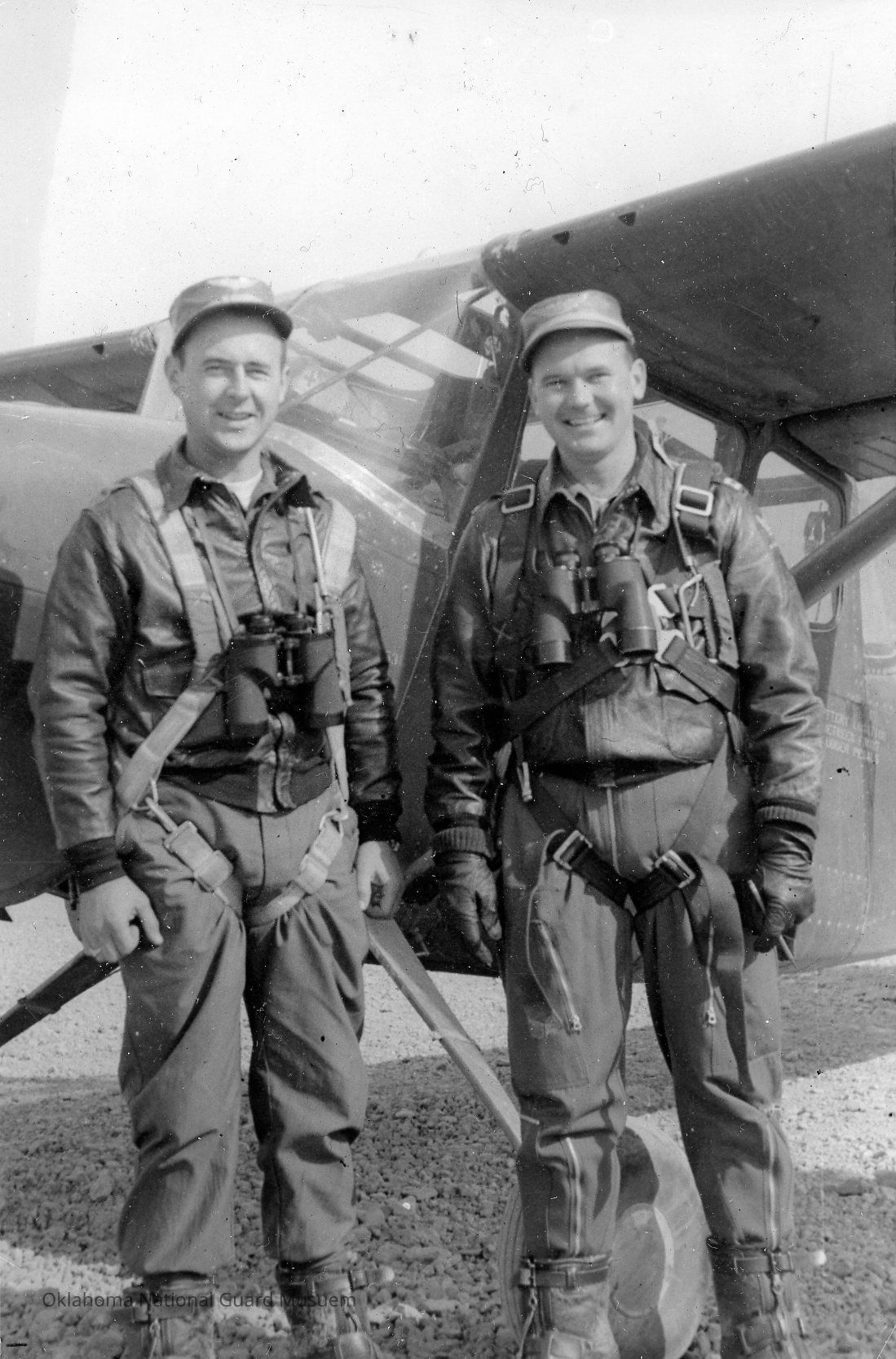 Loehr M. Rigby, 189th Field Artillery Chief Observer (Right) and Harold B. Van Dyken (Left) pose in front of an L-4 Grasshopper