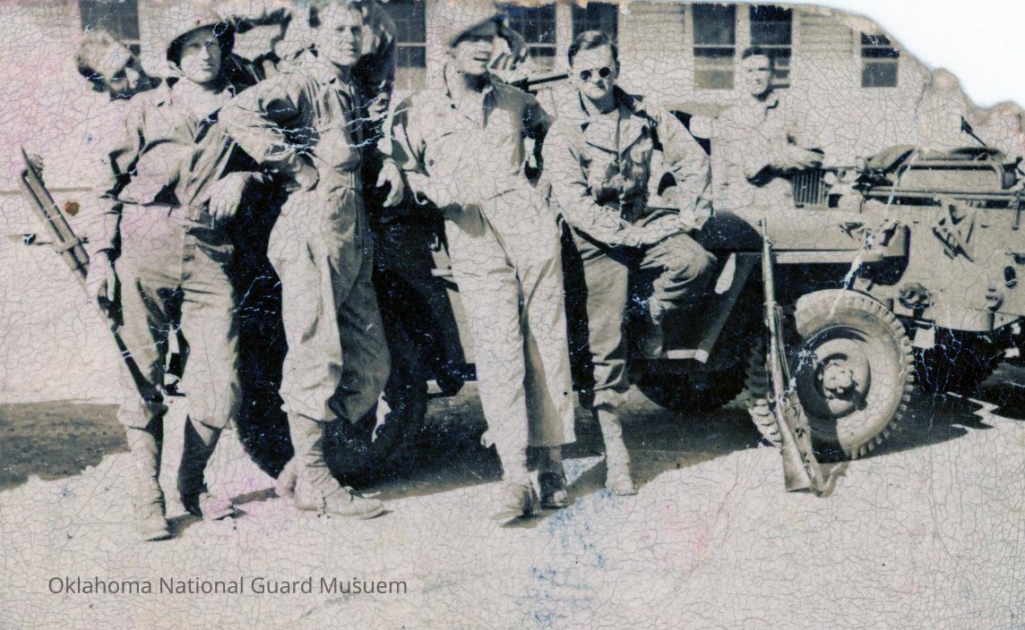 Soldiers of the 179th Infantry Wire Section 3rd Battalion pose in front of a Jeep