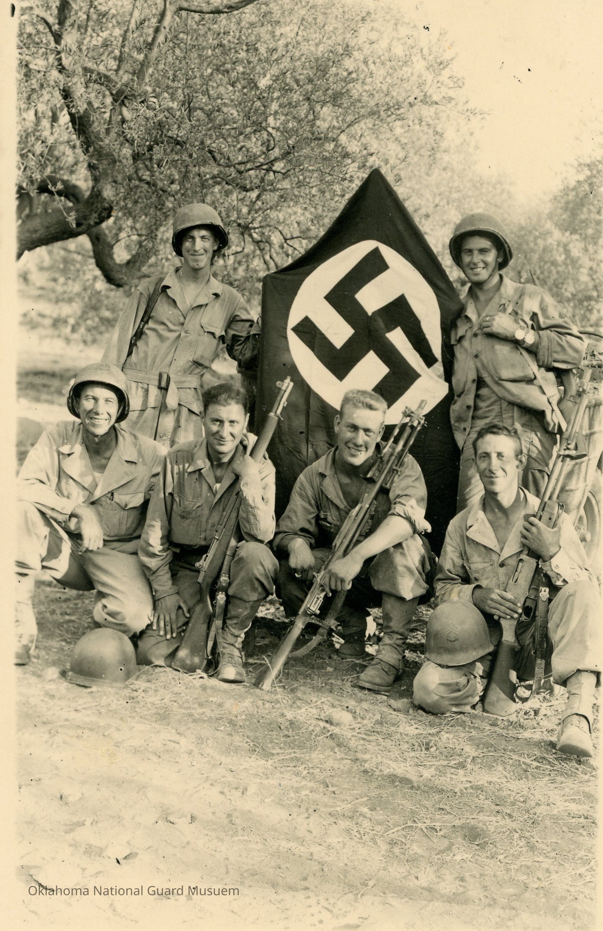 Soldiers posing with captured Nazi flag