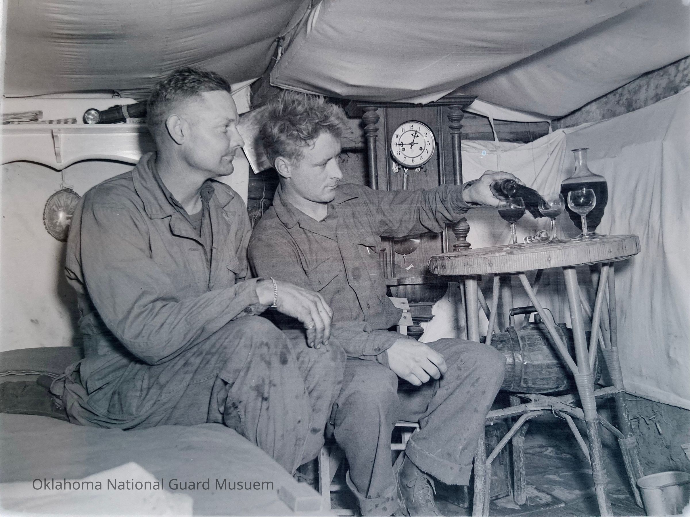 Photograph published in the 45th Division News, 22 March 1944, Vol. IV, No. 33, Caption "If there are better and more comfortable ways of sweating out the shelling or an air raid than this, you'll have to show Sgt. Herman L. Penn, Altus, OK (left) and Pvt. Eddie Lewandowaki, Beaver Dam, WI, owner of this shelter-deluxe. Eddie's house is walled with white silk, floored with tile, decorated with pictures, timed with a handsome clock, and flowing with some of the best wine on the beachhead."Made/Created