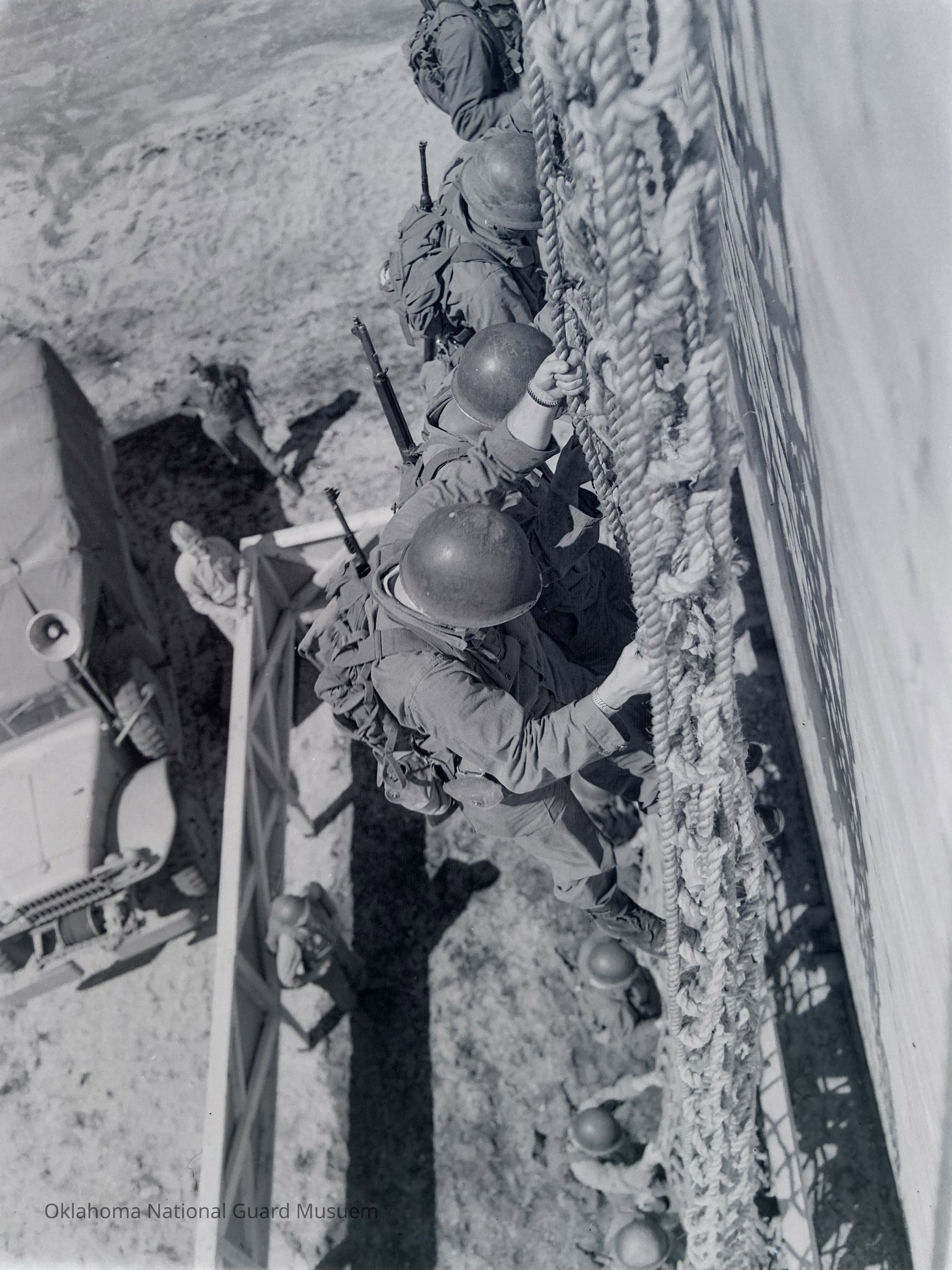Negative of soldiers practicing climbing down the side of a ship on cargo nets in Hokkaido, Japan