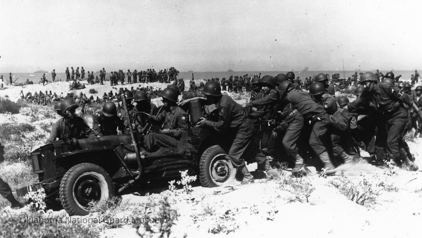Soldiers pushing jeep through the sand