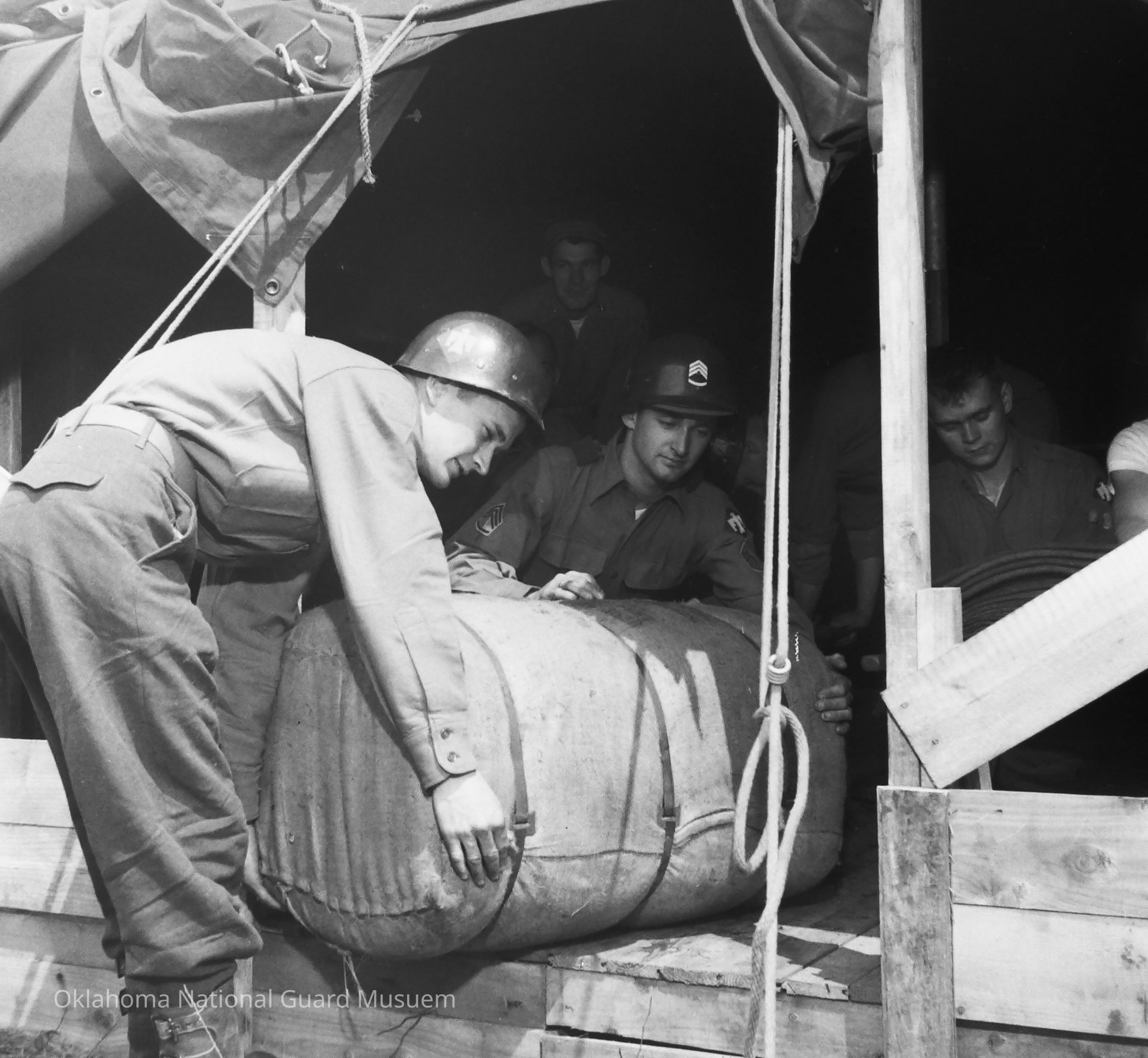 Negative of soldiers putting large duffle bag into tent