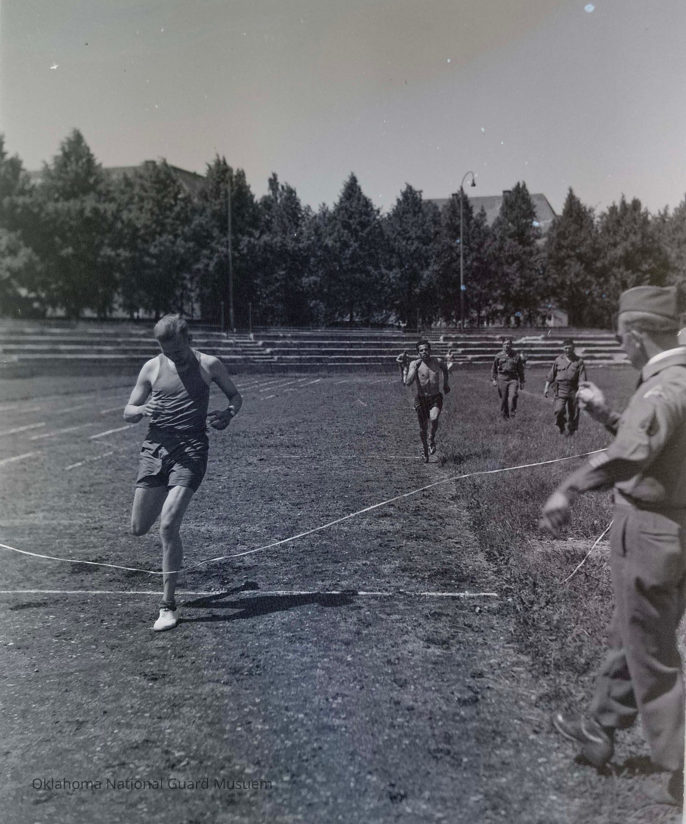 Negative of soldiers racing in the one mile run