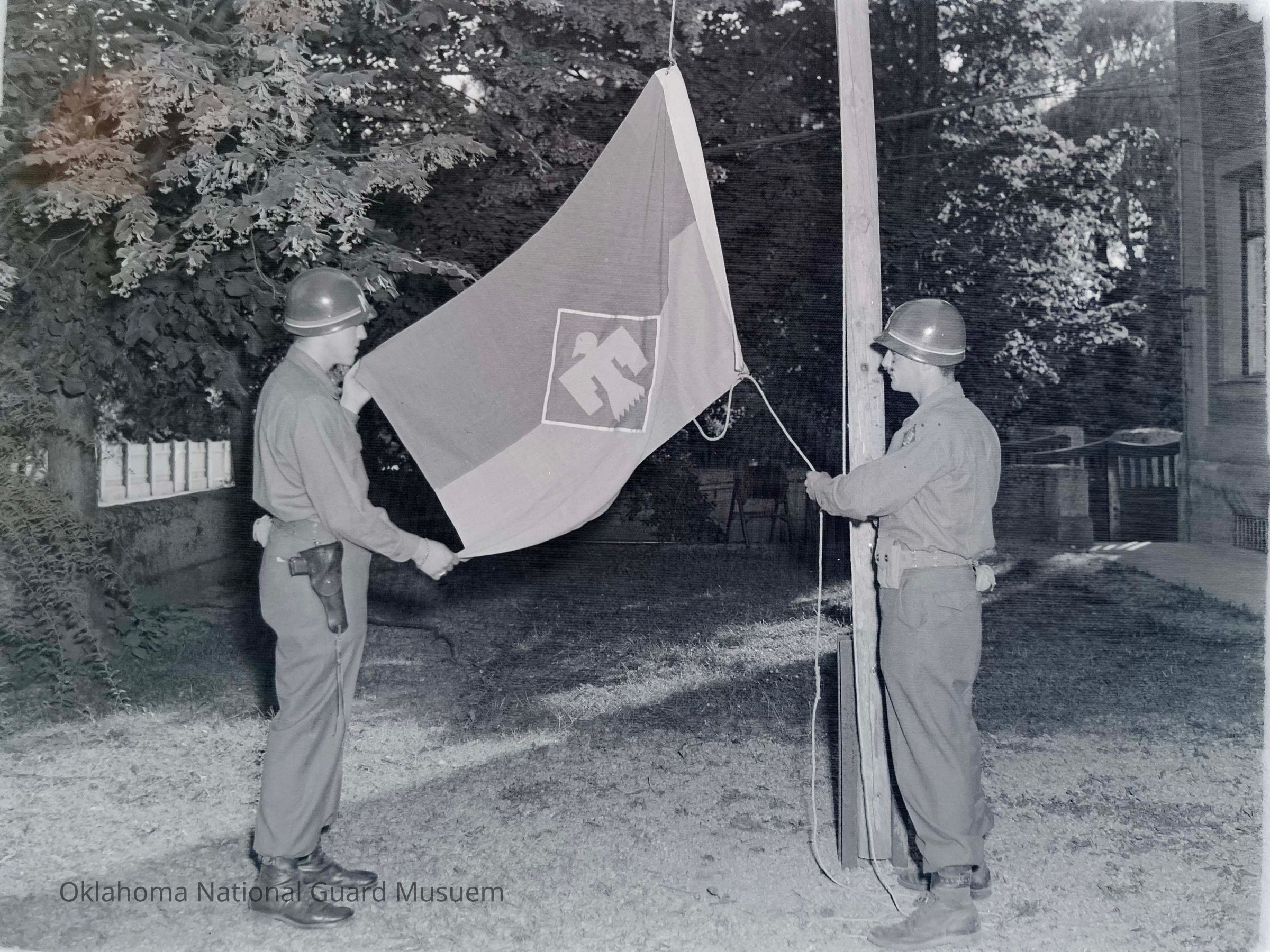 Negative of two soldiers raising the 45th Division flag over Division Headquarters