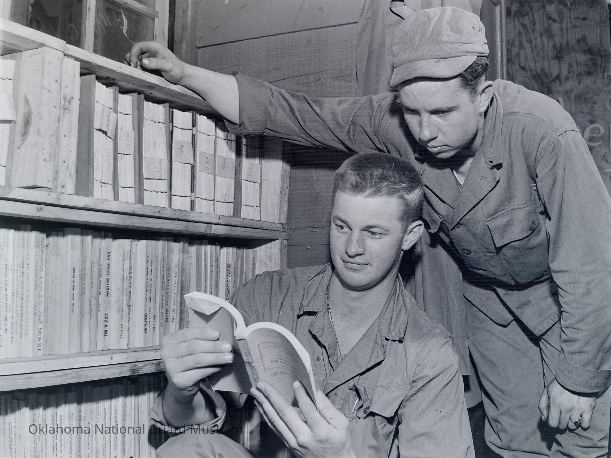 Negative of soldiers reading a technical manual in a library on Hokkaido, Japan