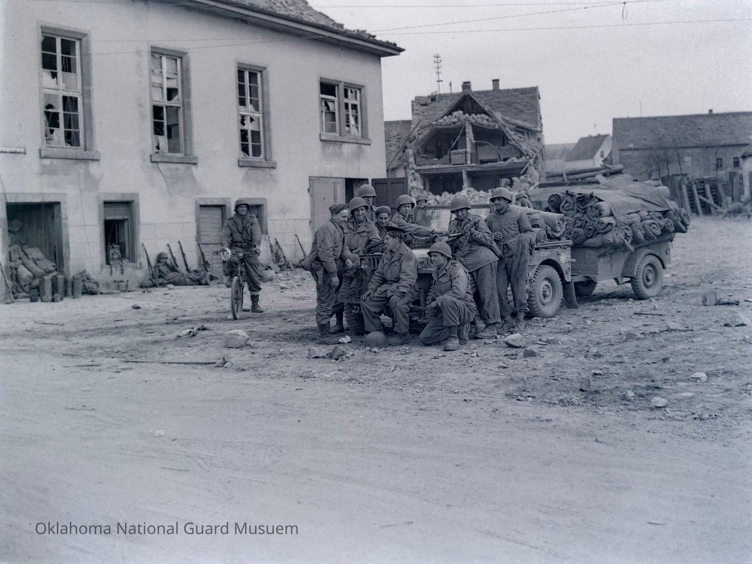 Negative of soldiers of the 180th Infantry Commo Section relaxing near a Jeep amid damaged buildings