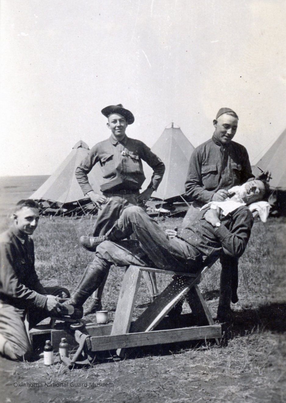 Soldiers posing around a soldier laying in a chair about to be shaved and getting his boots shined