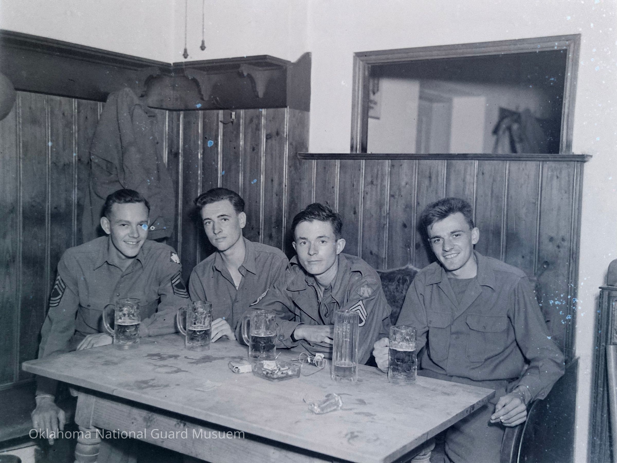 Negative of soldiers relaxing and drinking. 195th Public Information Unit