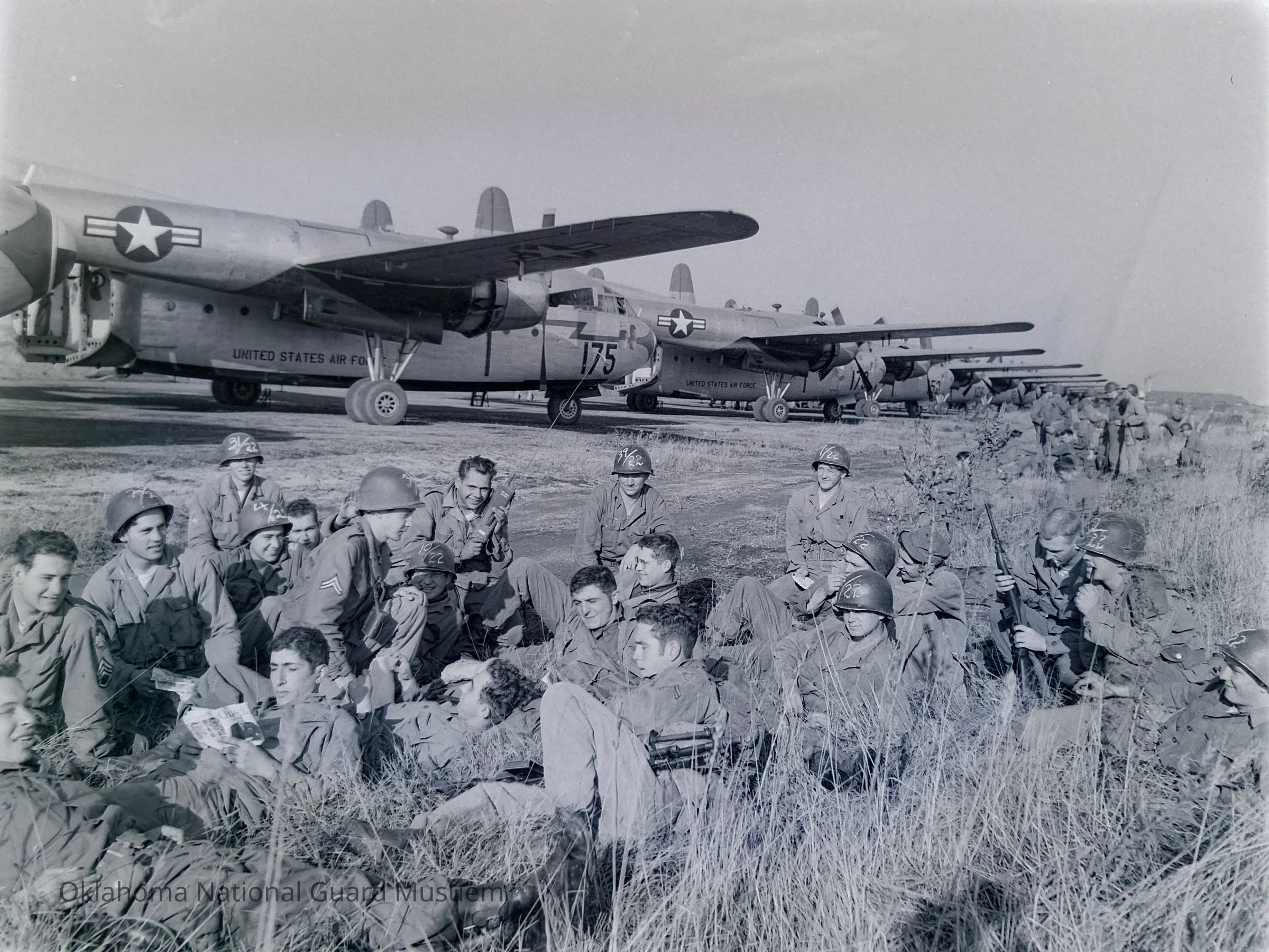 Negative of soldiers relaxing at the edge of a flight line with transport aircraft in background. 45th Special Forces