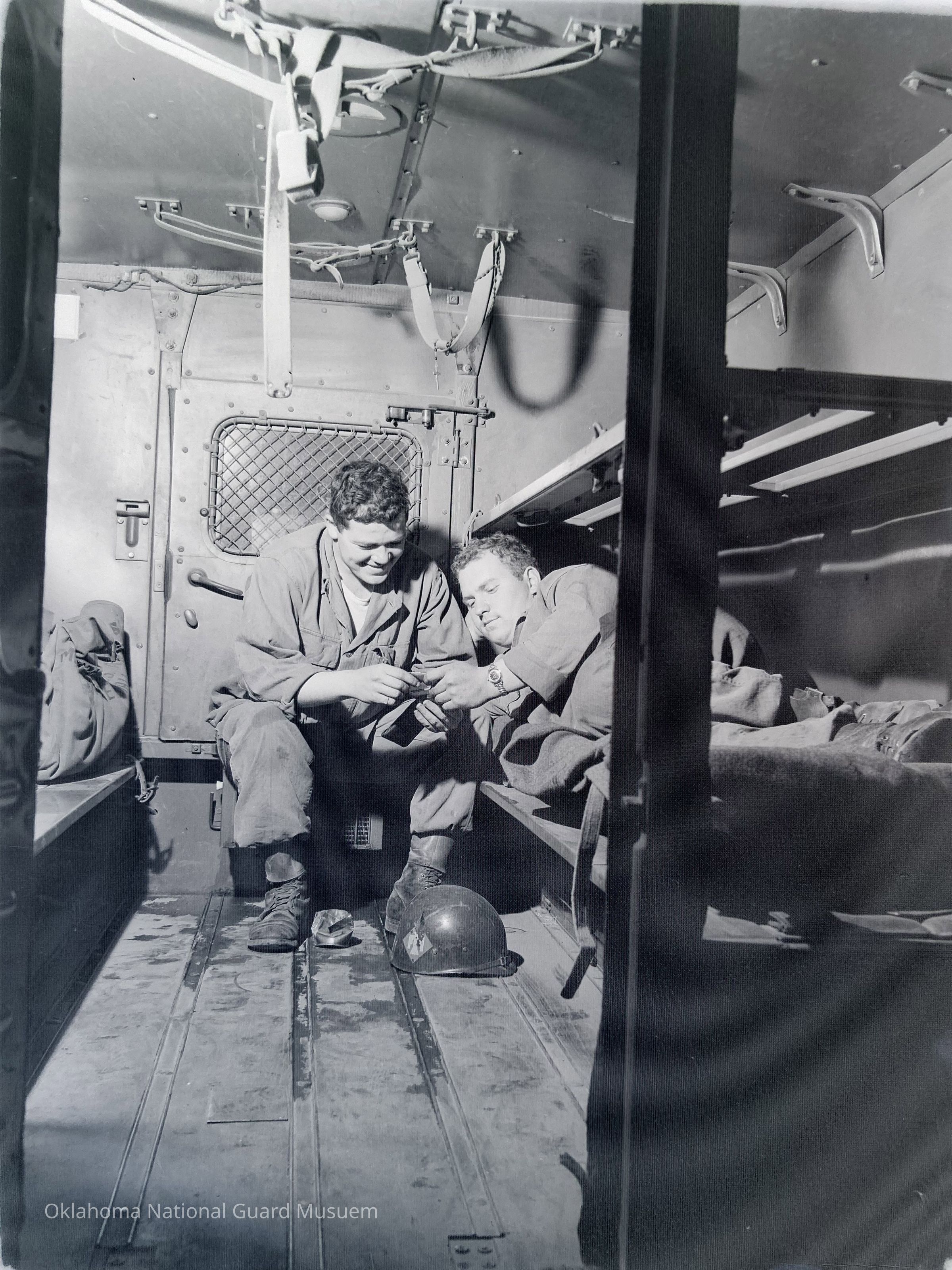 Negative of soldiers relaxing in the back of an ambulance on Hokkaido, Japan