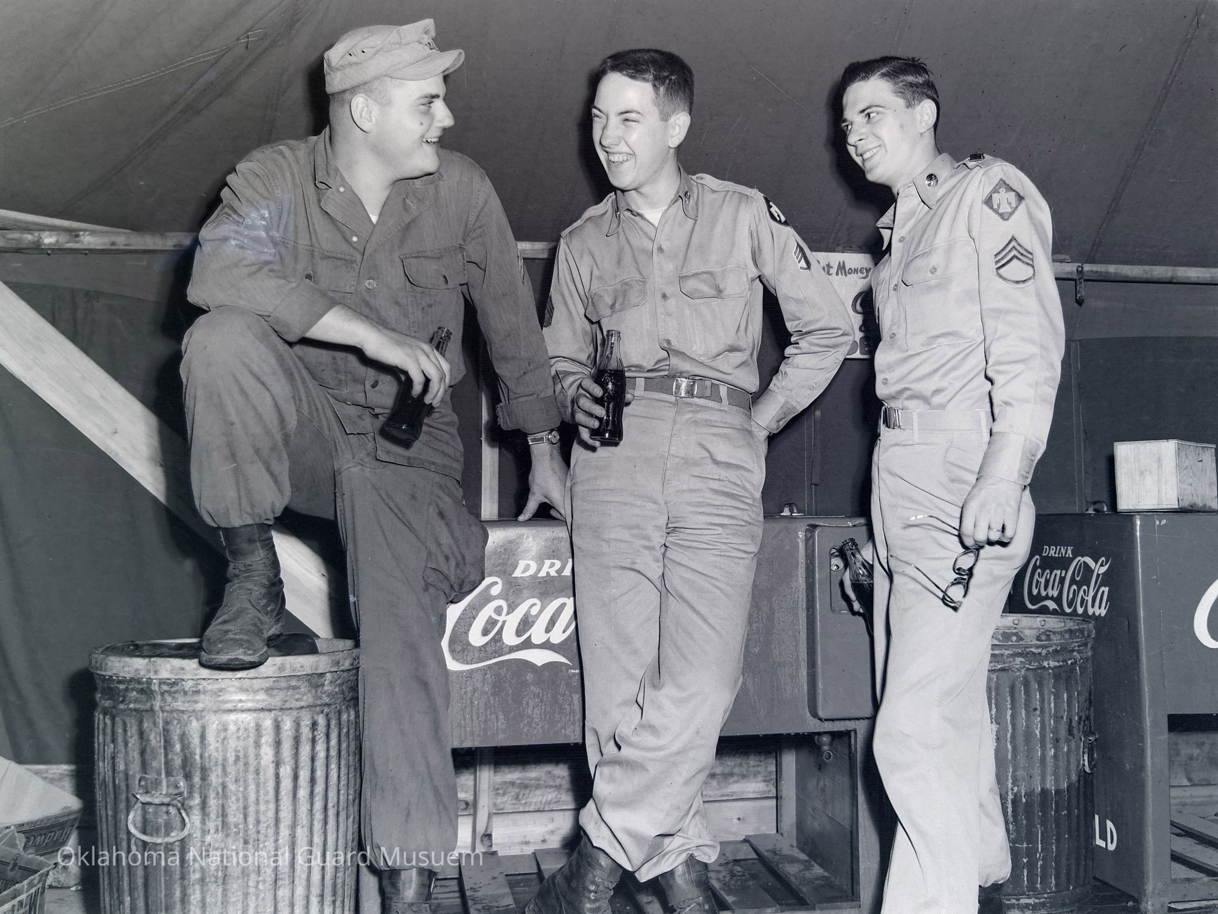 Soldiers relaxing with Cokes inside a tent