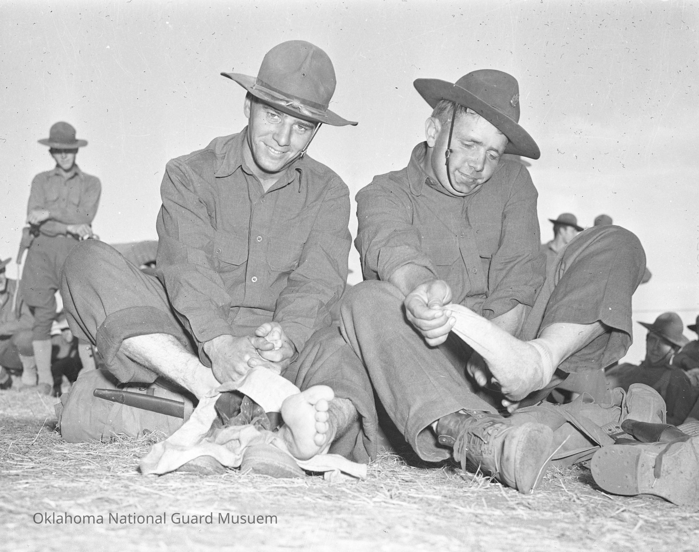 Negative of soldiers removing their shoes and socks during inspection