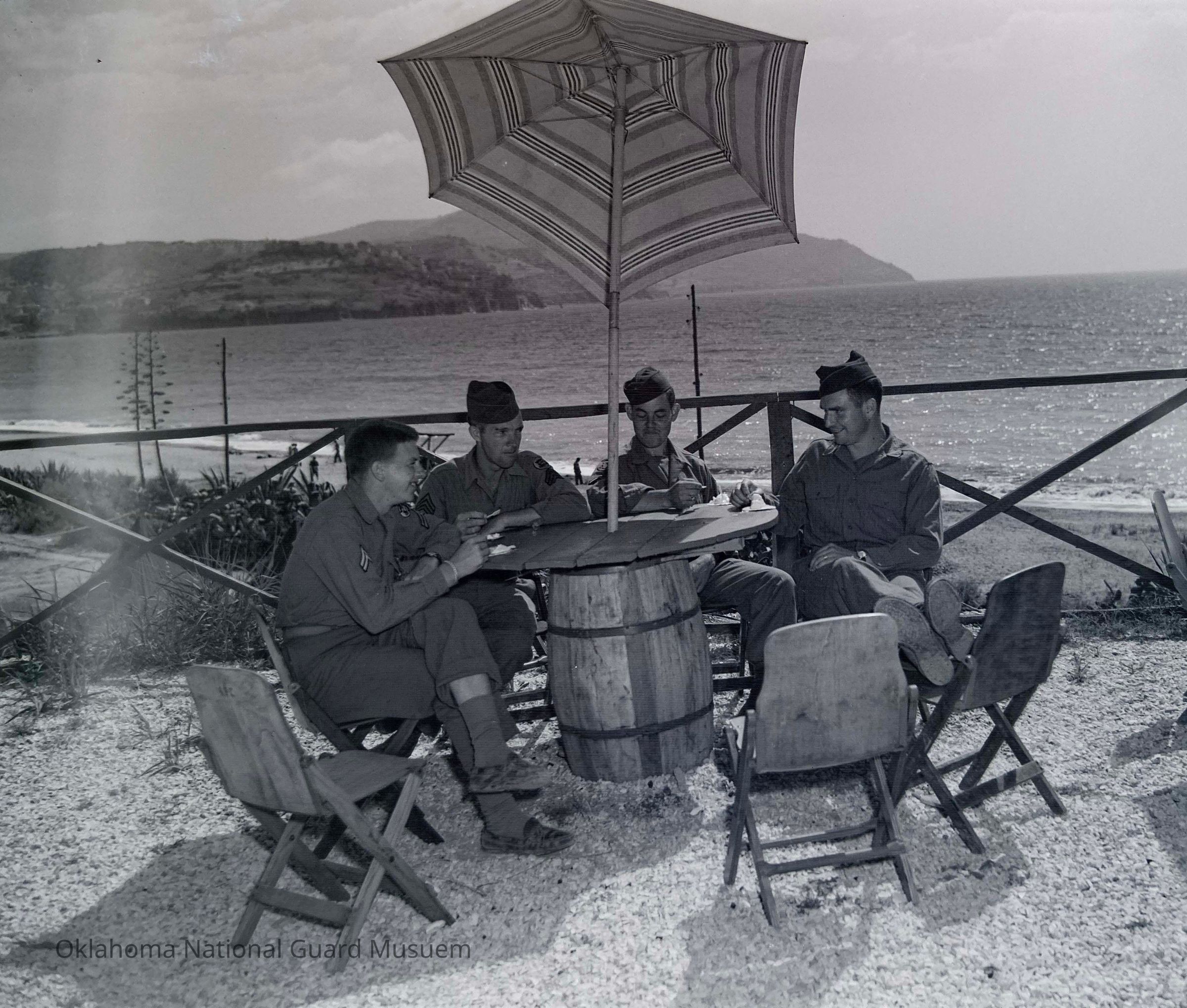 Soldiers resting under umbrella on the beachEntry/Object ID