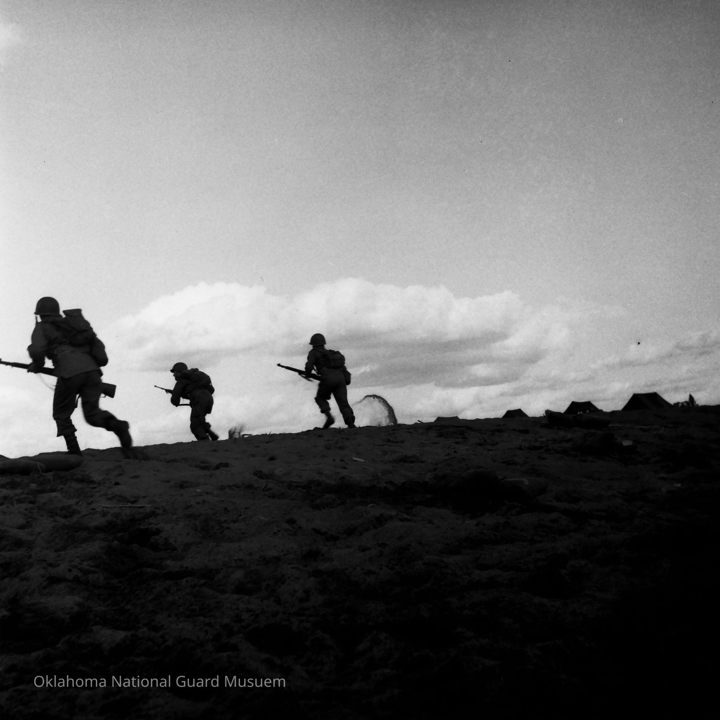 Negative of soldiers running across beach with rifles