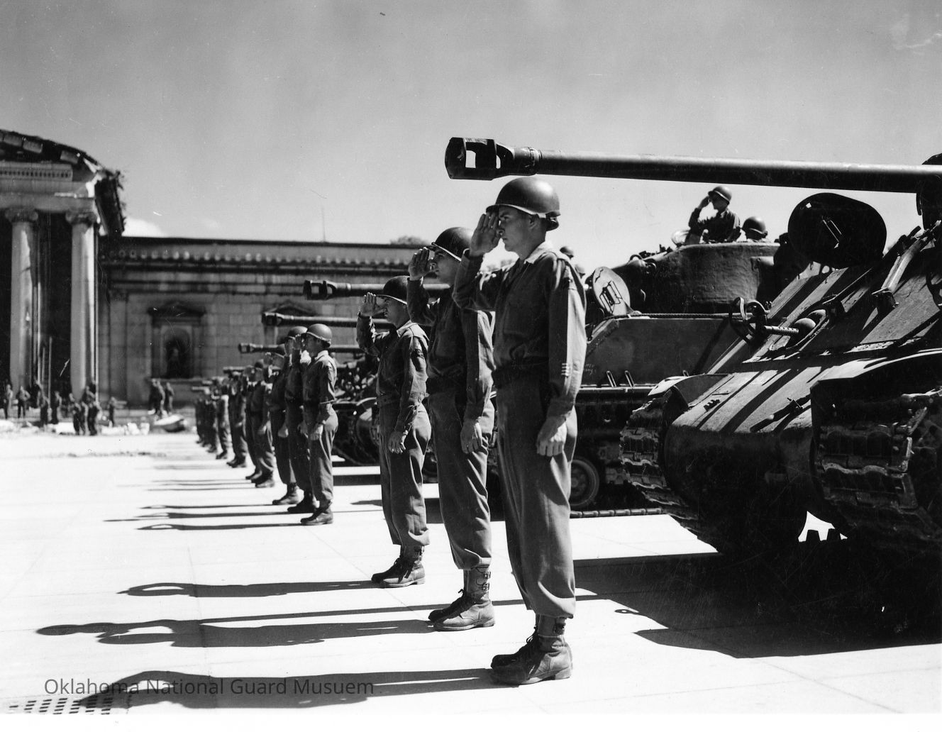 Soldiers saluting in front of tanks