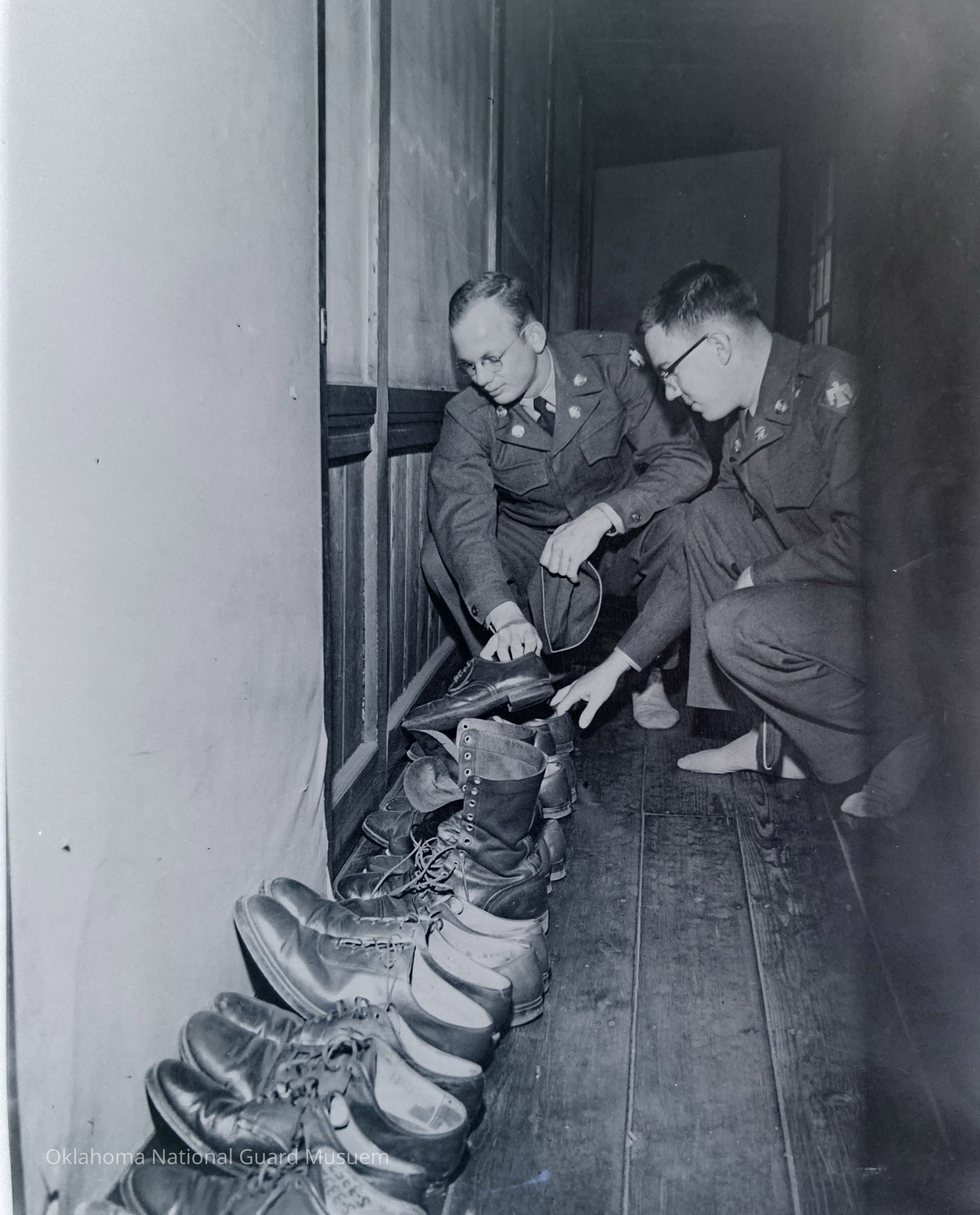 45th Division News Vol. IV No. 32 "Shoes must be removed before entering the temple. John Rust (Shreveport, Louisiana) and Gordon Smith (Alva, Oklahoma) put their shoes in place. Both belong to the 45th Signal Company."
