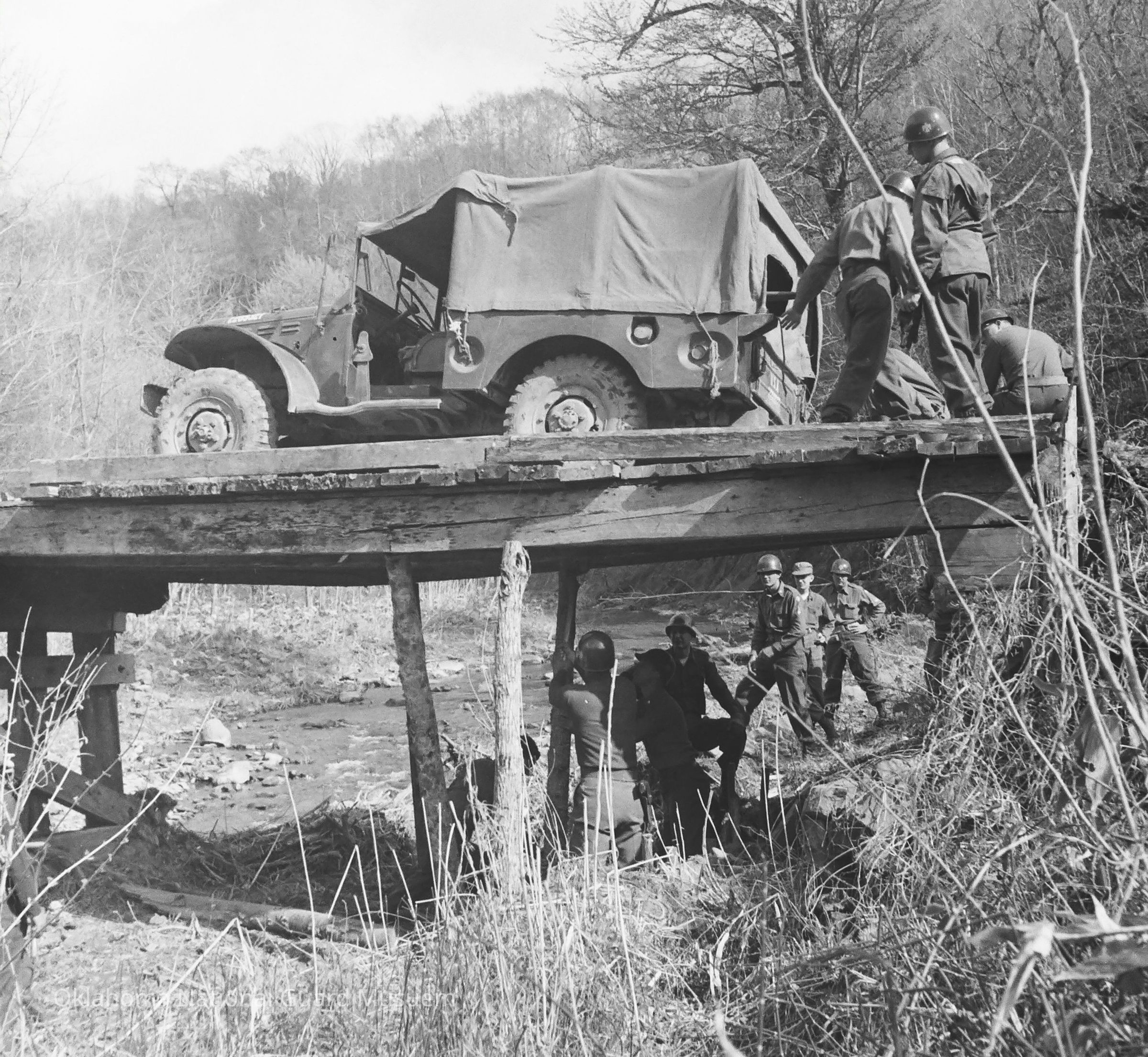 Negative of soldiers securing a wooden bridge
