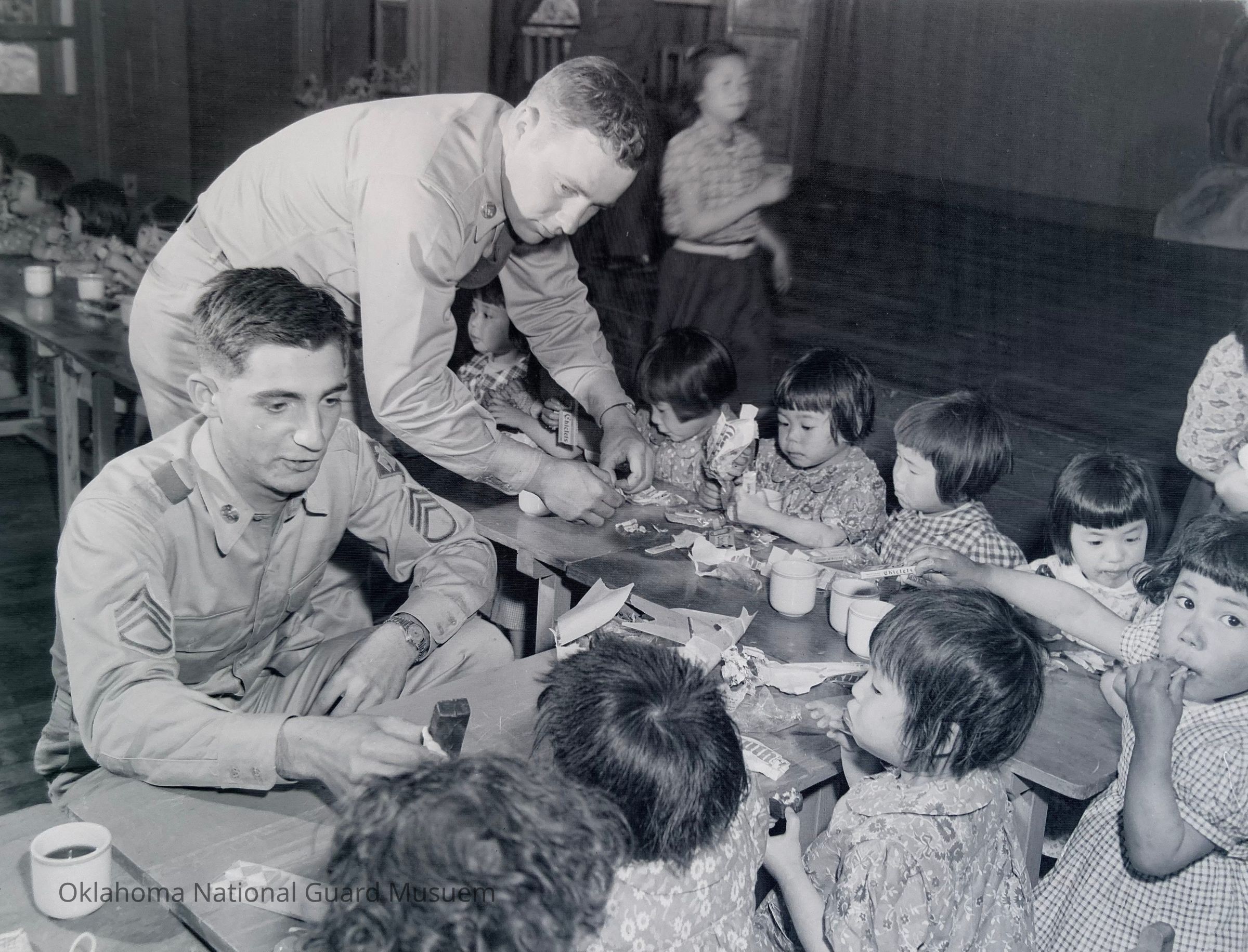 Soldiers sharing candy with Japanese children in a dining room