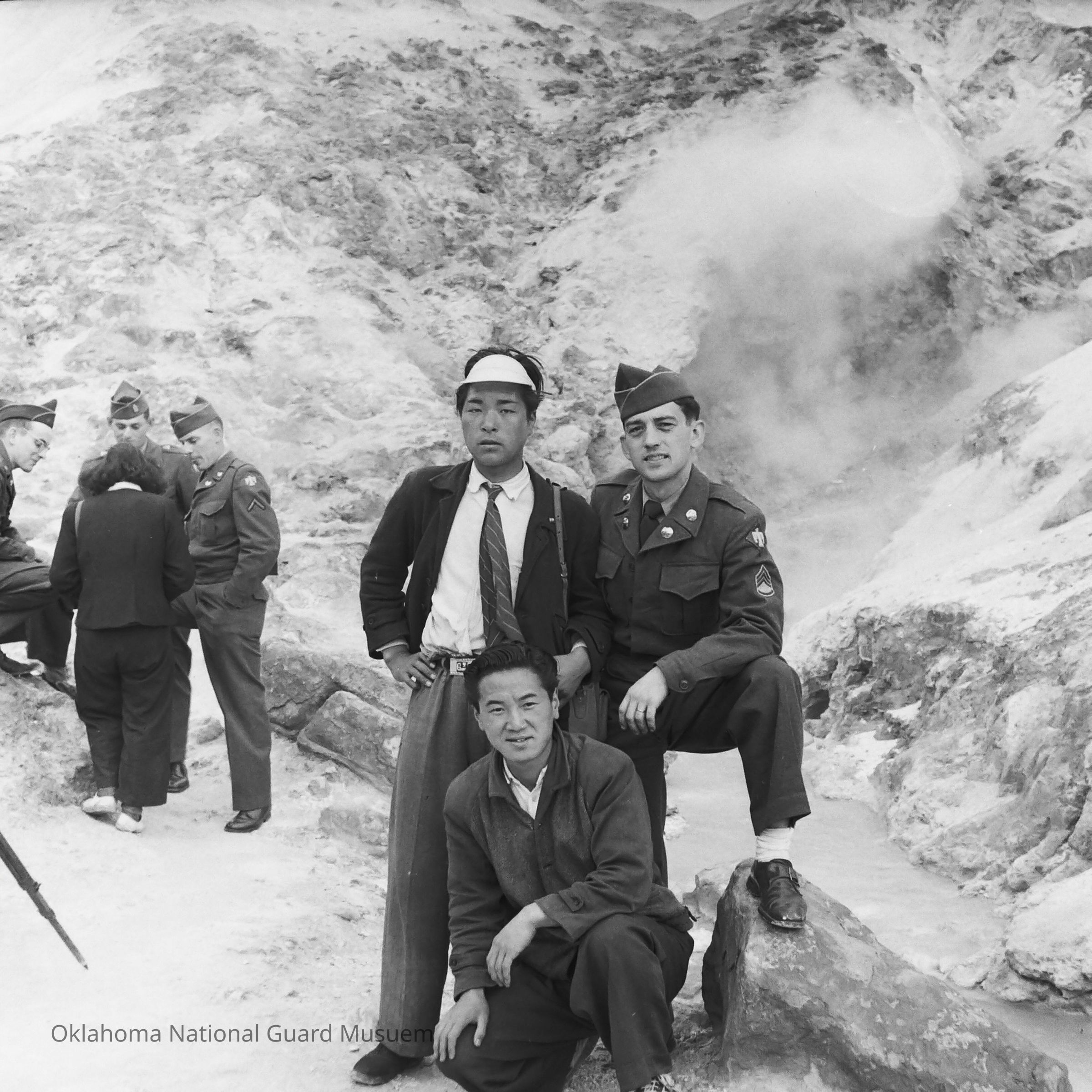 Negative of soldiers sight-seeing with Japanese civilians