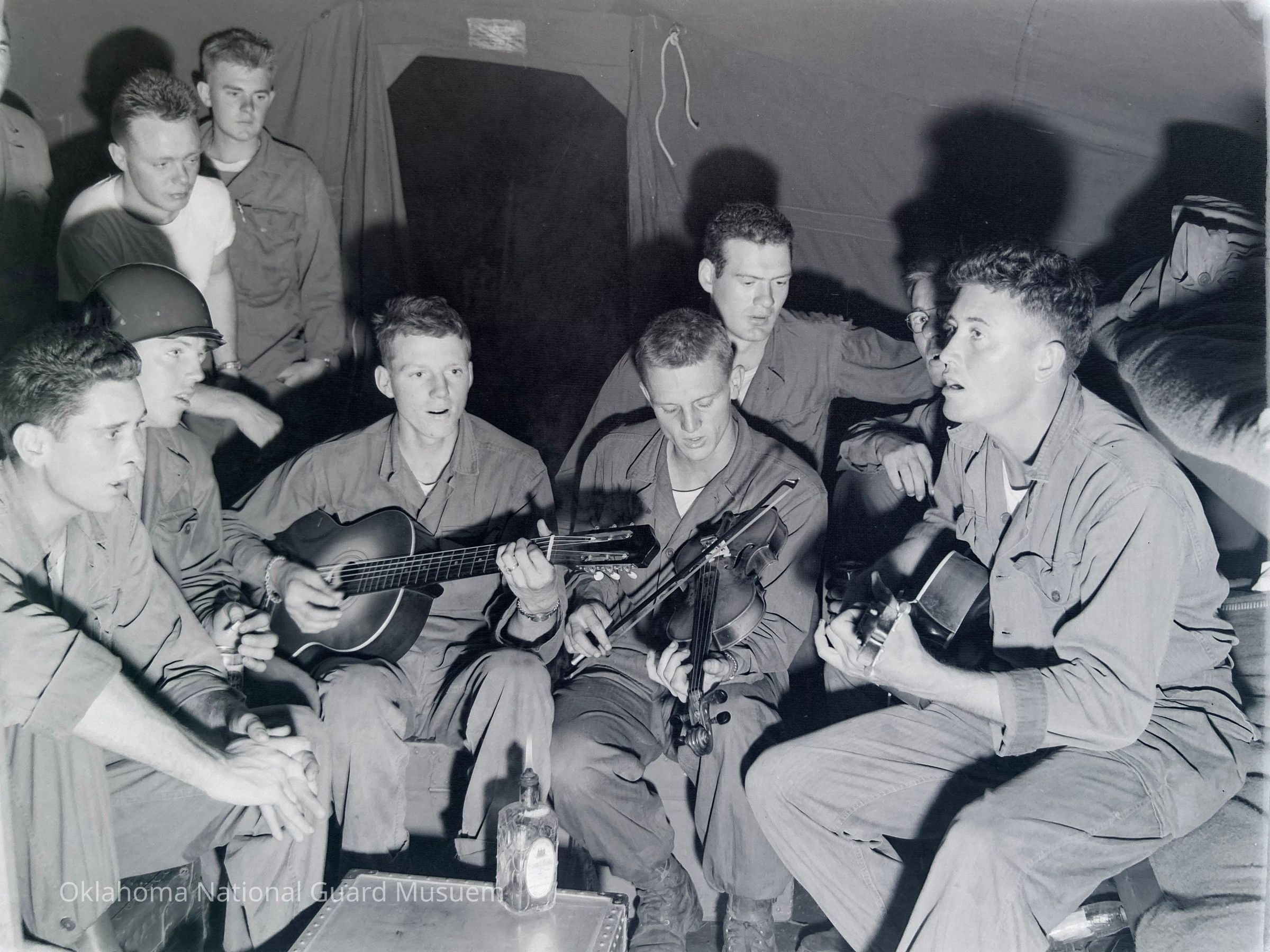 Soldiers singing accompanied by guitars and a fiddle