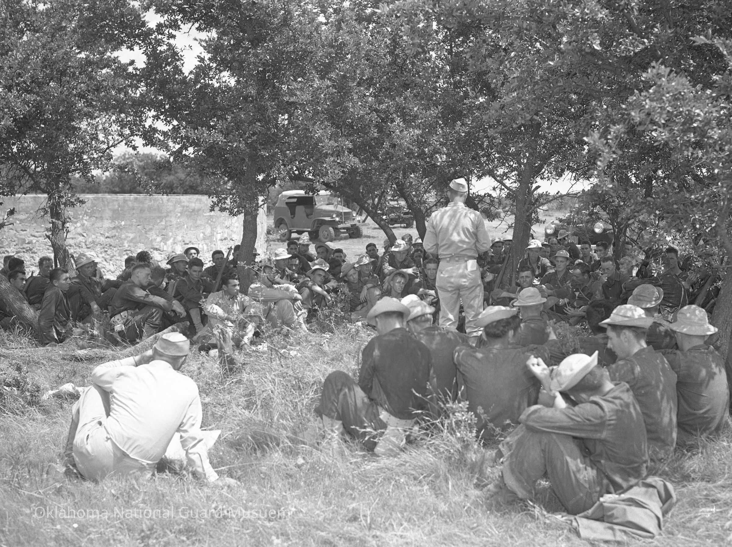 Negative of soldiers sitting and listening to an officer