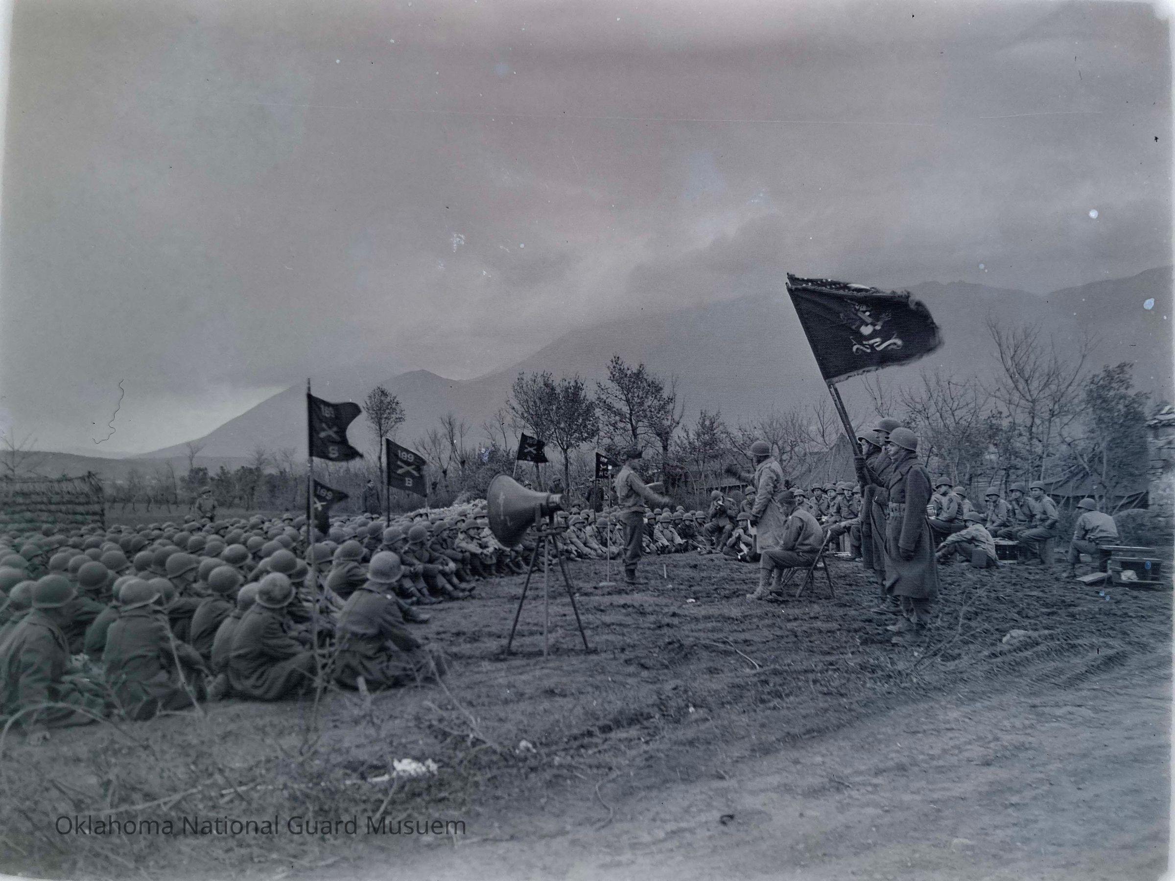 Negative of soldiers sitting during ceremony