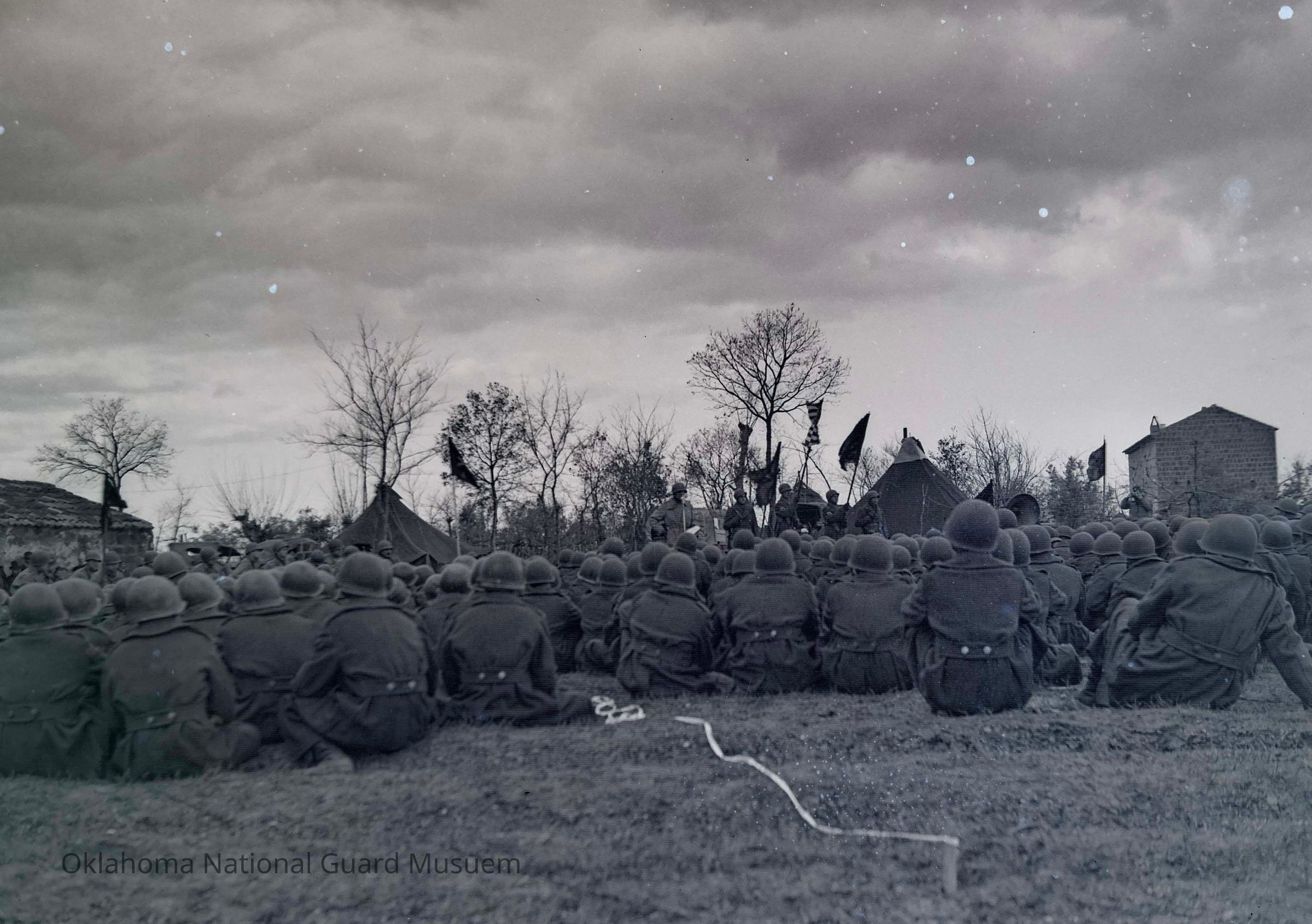 Negative of soldiers sitting during ceremony