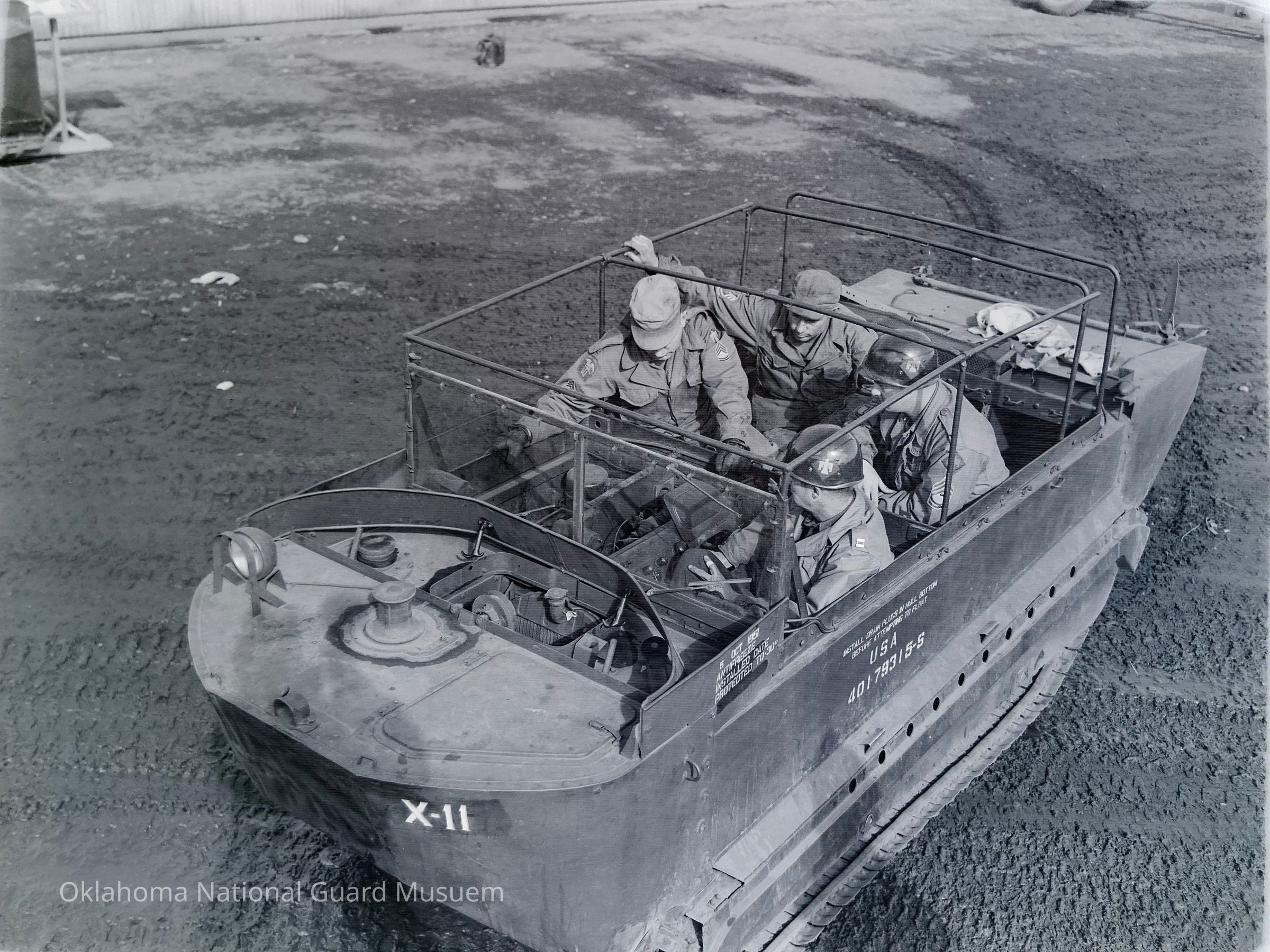 Negative of soldiers sitting in an amphibious tracked vehicle