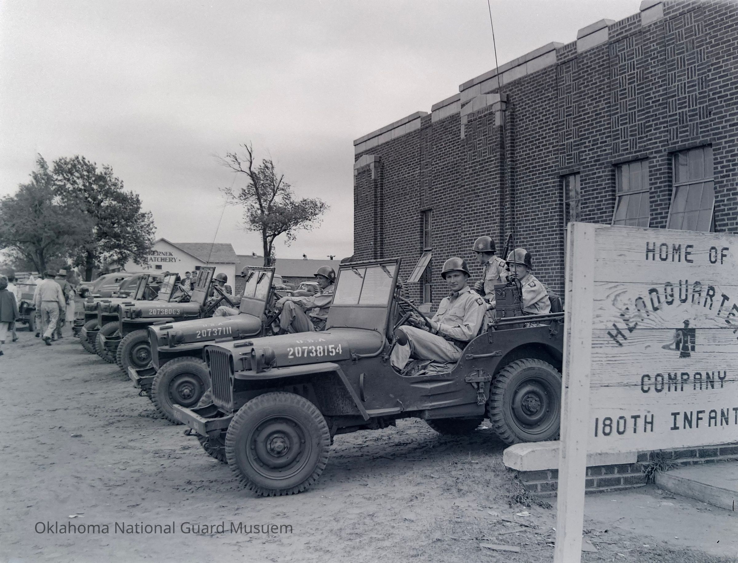 Negative of soldiers sitting in jeeps outside of Headquarters. Disaster response after the Holdenville tornado. 180th Infantry