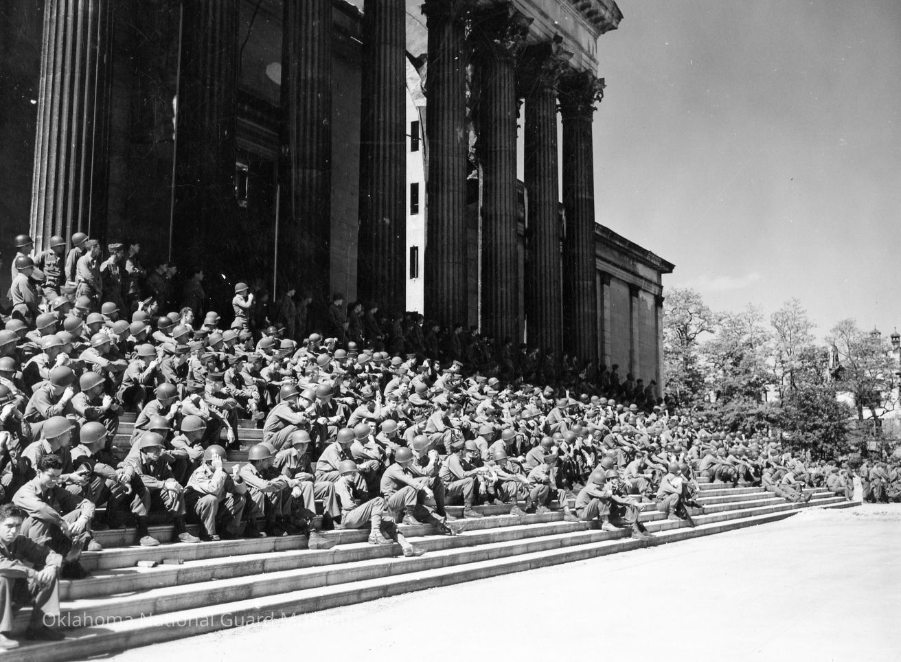 Soldiers sitting on the steps of the Glyptothek, former art museum, watching the 45th Division's Memorial Day service