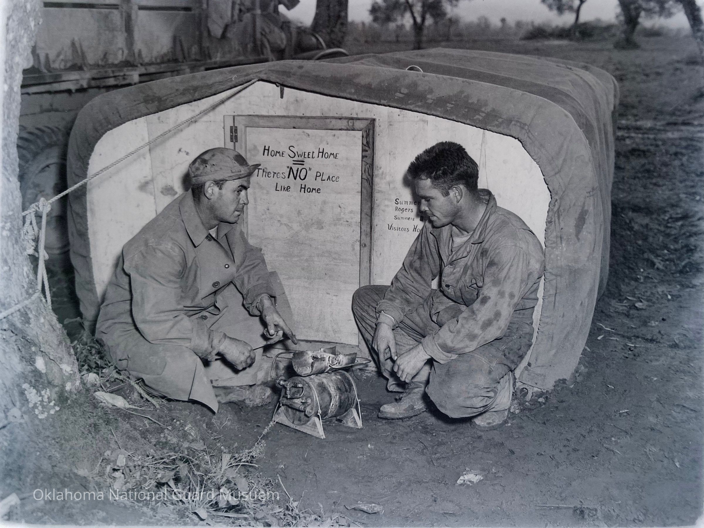 Photograph published in the 45th Division News, Naples, Italy, 4 December 1943, Vol. IV, No. 21, Caption: "Home was never like this back in Healdton, Oklahoma for the Summers brothers, Cpls. Jack (left) and J.L, but the contraption beats sleeping in a pup tent. Using facilities at hand in their Quartermaster Maintenance Section, the pair spread a large tarp over bows of six-by-six, built rear and front walls, a front door - and there it was. The interior boasts electric lights from a truck battery and a stove constructed from a few Jerry shell casings and odd and ends salvaged from damaged trucks."Made/Created